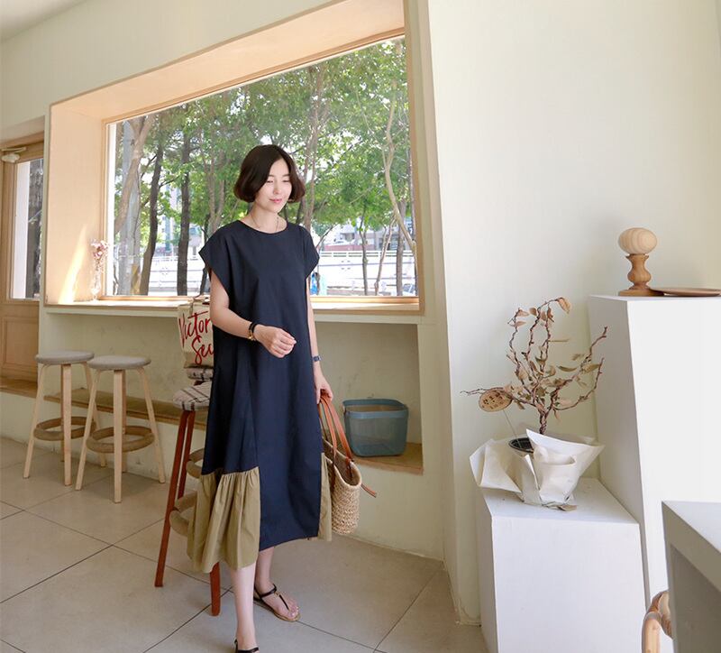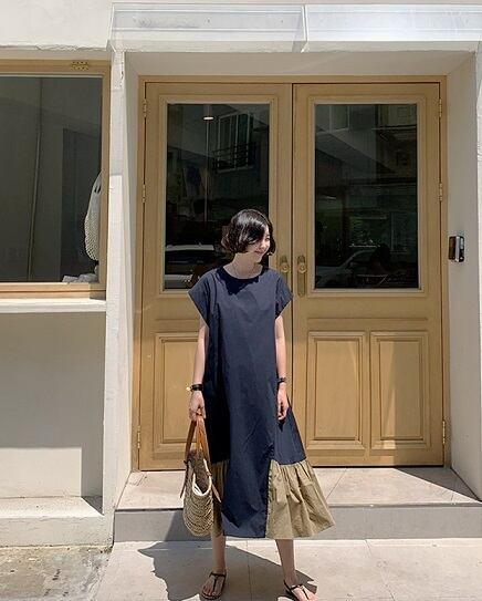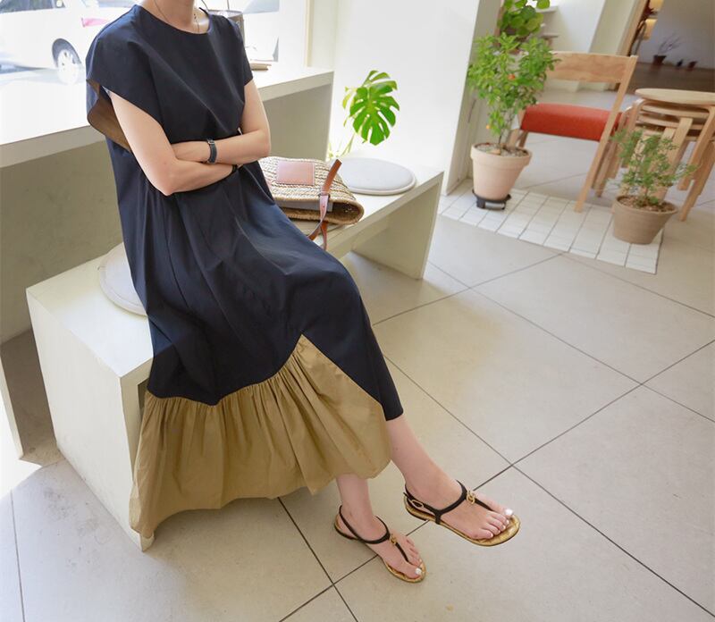 ワンピース レディース ロング丈 膝下 カジュアル オシャレデザイン シアン ブラック 2色カラーバリエーション ゆったり Sサイズ Mサイズ Lサイズ XLサイズ フレア裾 ふんわり 凉しげ Aライン 袖あり 半袖 ラウンドネック 襟なし ママ マタニティ 20代 30代 40代 50代 60代 公園 夏 お出かけ デート バイカラー 通勤 通学 リゾート プール 水族館 女子 女性 カジュアル ラフ 大きいサイズ 小さいサイズ 大人カラー くすみカラー 楽チン 動きやすい 母の日 お泊まり 旅行