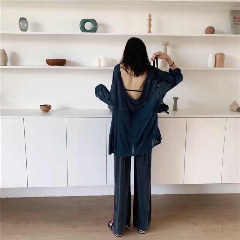 トップス レディース パンツ 上下セット セットアップ 長袖 長ズボン ロング丈 バックオープントップス ロングTシャツ ゆったり オーバーサイズ かわいい 大人可愛い 大人っぽい お洒落 カジュアル 上品 こなれ感 無地 ゆるシルエット 女性用 婦人服 普段着 普段使い ルームウェア 体型カバー フリーサイズ サイドスリット 送料無料 韓国ファッション インスタ映え セクシー 家デート フリーサイズ ネイビー カーキ ブラック 春 夏 秋 涼しい 動きやすい さっと着れる 背中開き 20代 30代