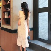 レディース ワンピース マーメイドワンピース Vネック ミドル丈 膝下 裾フリル ドレス 半袖 ホワイト S M L XL かわいい 大人可愛い 上品 エレガント シンプル キュート フェミニン セクシー ウエストリボン スタイルアップ 細見え メリハリ 女性用 OL 学生 通勤 通学 普段使い デート 女子会 お出かけ ディナー 記念日 送料無料 韓国ファッション インスタ映え おしゃれ 10代 20代 30代 無地 透け 裏地付 ボリューム袖 二の腕カバー ハイウエスト 脚長 お呼ばれ モテ 春 夏