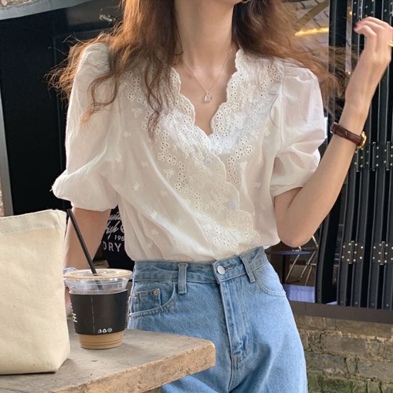 パフスリーブブラウス 韓国スタイル シック 半袖シャツ 女性 夏 新しい 刺繡レース クロスVネックデザイン センスニッチ トップ ホワイト プチプラ 送料込み クール リゾート 涼しい ワンサイズ サイズフリー アジアン 旅行 着回し レディース こなれ感 モダン 上品 レース プチプラ 都会 OL 大人女子 パフスリーブ 女性らしいスタイル アウトドア 二次会 パーティー 披露宴 ホームパーティー 新作 結婚式 エレガント 存在感 ポリエステル シック スタリッシュ 存在感