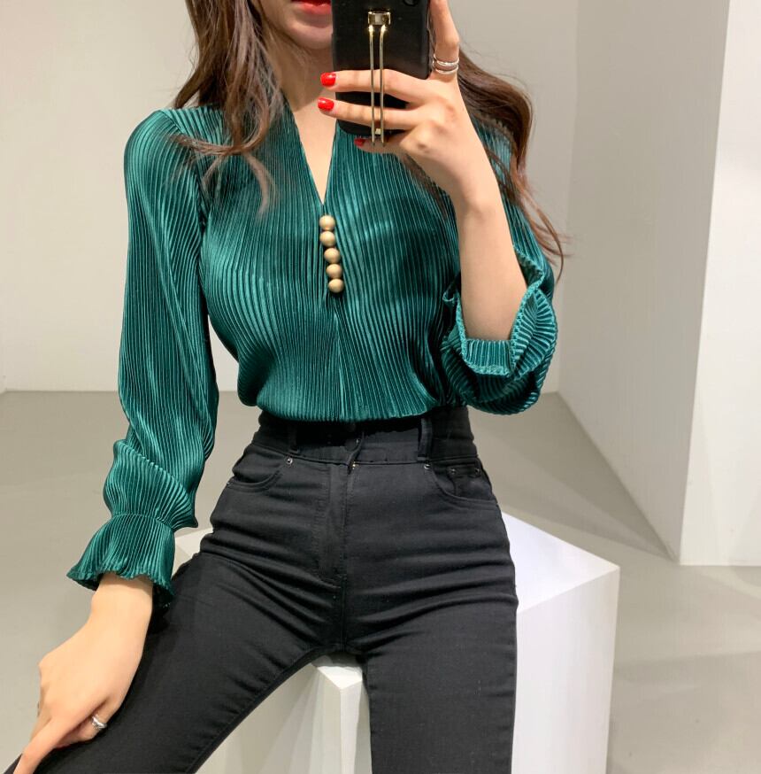 プリーツ シャツ Vネック ボタン付き 全3色 韓国 シック トランペットスリーブ ルーズ グリーン アプリコット ネイビー シャツ無地 ピットストリップ シャツ女性 女性用 細身 大人カラー フェミニン エレガント 大人上品 ガーリー韓国系 モダン 主役級 存在感 きれいめ アイテム イベント お出かけ 休日 通勤 OL 謝恩会 結婚式 二次会 パーティー 女子会 ランチ アフタヌーンティー20代 30代 春 夏 モテ インスタ映え ファッション トレンド ランキング インスタグラム クール