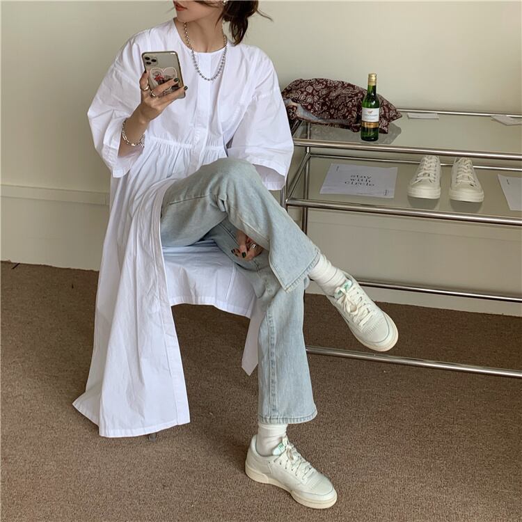 ワンピースとしても、トップスとしても使える、小物使いでたくさんアレンジ可能なコットンワンピース☆1枚持てば、最近流行りの韓国風こなれファッションが完成します♪