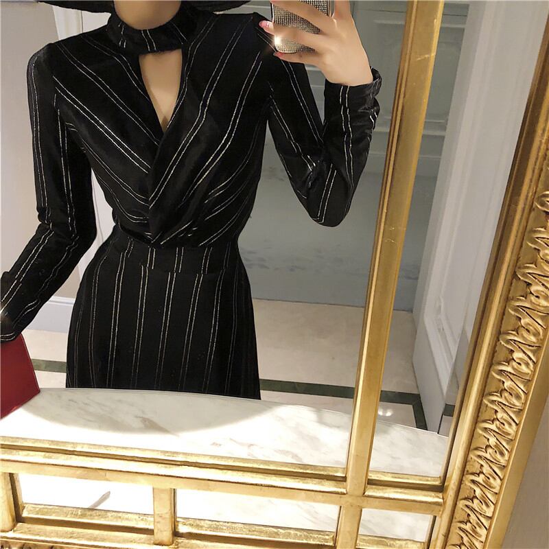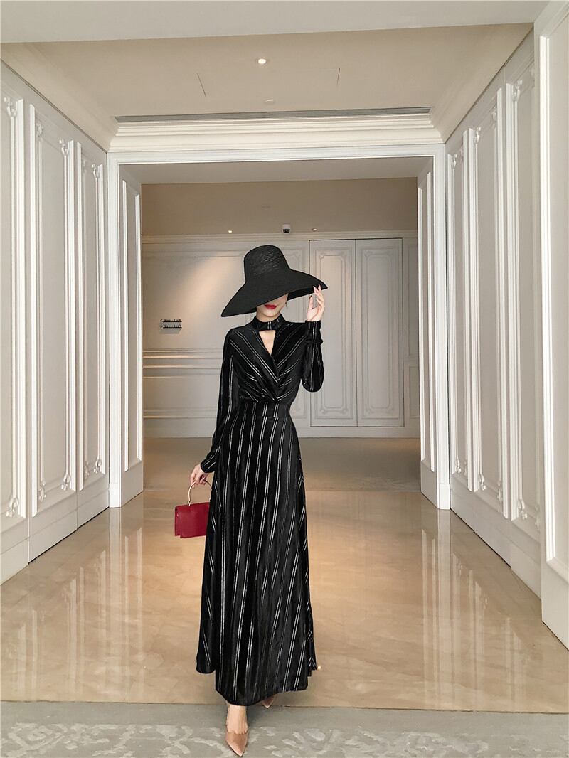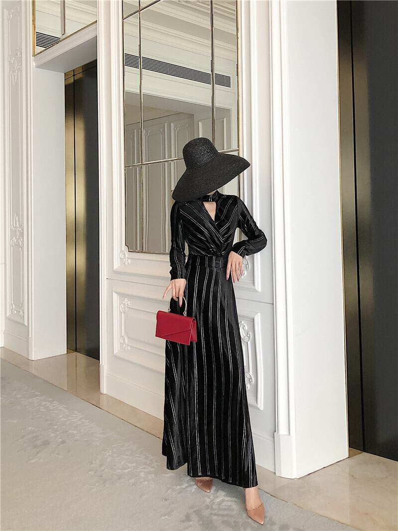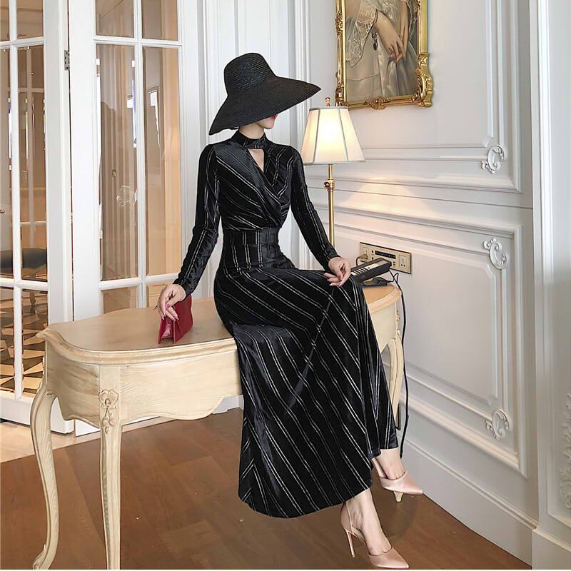 ロングドレス レディース 女性用 ワンピース ロングワンピース チョーカ風 ストライプ ロング Vネック 長袖 袖あり マキシ Aライン ホームパーティー 結婚式 二次会 謝恩会 レトロ 春 スリム 細身 ジッパー 韓国系 ハイウェスト 大きいサイズ ワンカラー ブラック 大人女子 クール きれいめ 上品 モダン 存在感 主役級 フォーマル OL 10代 20代 30代 ママ マタニティ ビジネス 通勤 オフィス イベント パーティ 女子会 休日 お出かけ 誕生日 イベント ナイトライフ モテ 新着