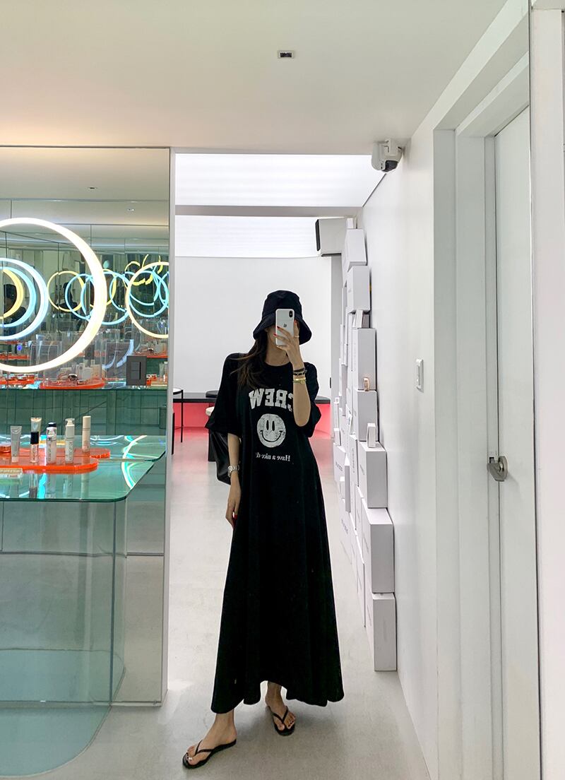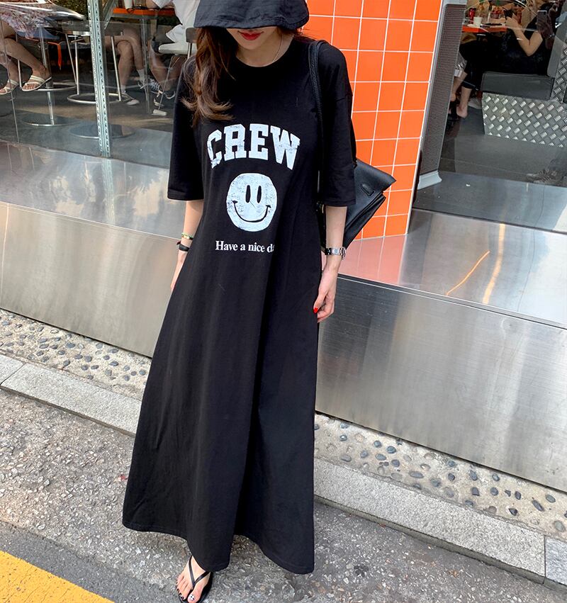 Tシャツワンピース レディース 女性用 2色 ロング 5分丈 スマイルプリント クルーネック マキシ 無地 コットン 半袖 袖あり カジュアル ロゴ 韓国系 夏 ワンサイズ ロングスカート ハイウェスト ストリート かわいい 大人カジュアル 大人可愛い シンプル 個人的 スポティー かっこいい こなれ感 ラフ 10代 20代 30代 ママ マタニティ オフィス 通勤 OL 学生 通学 お泊まり 母の日 誕生日 お出かけ 休日 アウトドア BBQ 遊園地 運動 公園デビュー 旅行 普段使い ゆったり