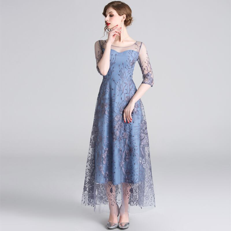ロングワンピース チュールワンピース レディース チュールドレス 七分袖 ラウンドネック ロングスカート ロングドレス フレアスカート 花柄 レース花柄 ボタニカル柄 後ろジッパー ハートスケイプ ハイウエスト 胸元レース ブルーグレー ブルー系 上品 さわやか 清楚 ドレス パーティー パーティードレス 演奏会 結婚式 二次会 謝恩会 お呼ばれ 舞台衣装 シースルー 透け感 すっきり ノスタルジック 大人女子 10代 20代 30代 サイズ豊富 コスプレ 無地 単色 春夏 クリスマス 格上げアイテム