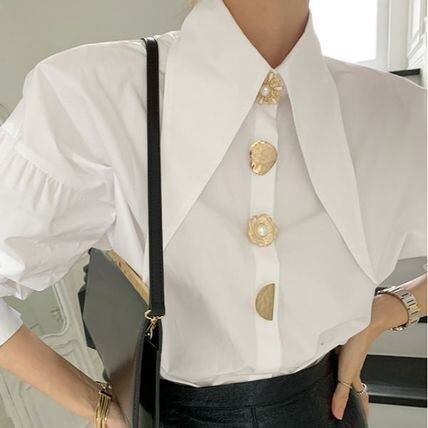 シャツ レディース ホワイト 襟ポイント アクセント スリーブ トップス ランタンスリーブ ドルマンスリーブ ゴールドボタン オーバーサイズ エレガント イブニング スタイルアップ ノースリーブ OL 通 勤長袖スリーブ 清楚 アクセン Yシャツ 夏 秋 20 30代 女子 女の子 レディ 綺麗 可愛い 上品 大胆 キュート おしゃれ モテ 女子力 デート パーティ 女子会 発表会 誕生日会 結婚式 2次会 夜会 夜景 ハイファッション 韓国 ファッショナブル デザイン インスタ映え プレゼント