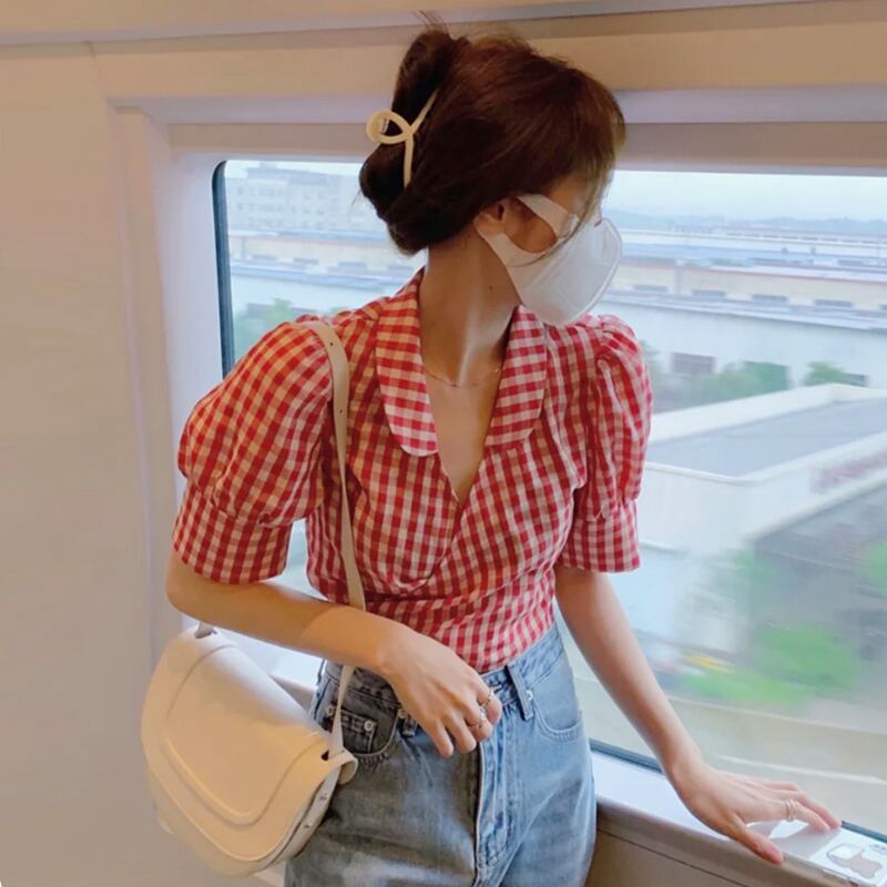 トップス ブラウス シャツ チェック柄 赤 レッド 半袖 パフスリーブ バックリボン スタイリッシュ インポートファッション 海外デザイン プチプラ 外国風 人気デザイン モテファッション ちょいセクシー 小悪魔ファッション クール レトロデザイン 可愛らしい かわいい シンプル カジュアル 大人 おしゃれ お洒落 大人可愛い 大人女子 ラブリー 10代 20代 30代 通勤 学生 通学 デート お出かけ お呼ばれ 休日 リゾート 旅行 海 プール 高原 ガーデン 着回し 普段使い モテ インスタ映え
