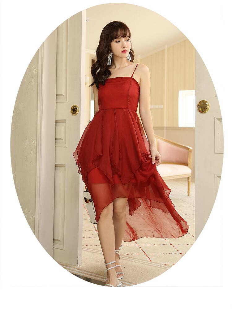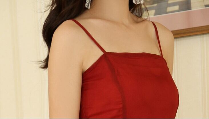 大胆な赤一色のキャミソールイブニングドレス....+*