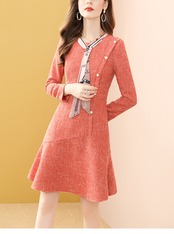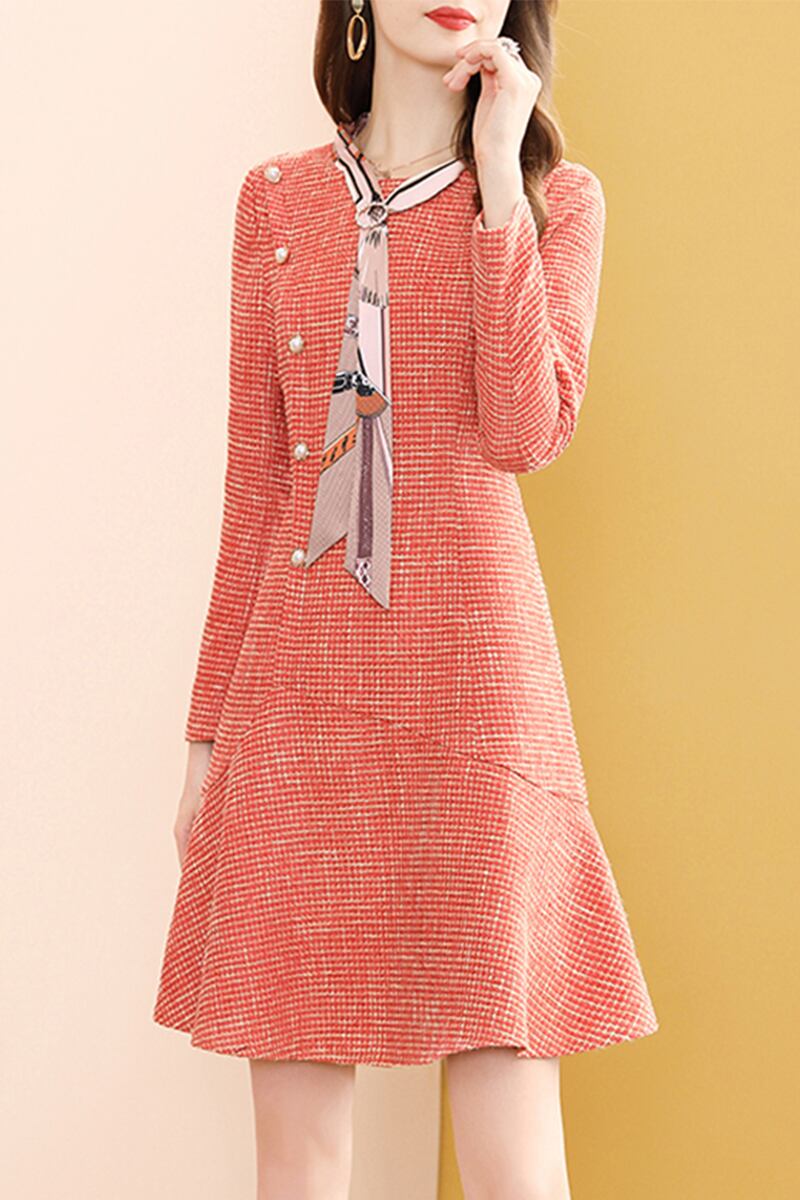 ツイード 赤 レトロ ワンピース スカーフ スカート ラウンドネック ロングスカート ウエストマーク ハイウエスト スタイルアップ 長袖 ひざ上丈 足長効果 ミドル丈 人気 流行 秋 冬 S M L XL 2XL 女性 レディース 20代 30代 女子 女の子 レディ 綺麗 可愛い 上品 洗練 気分アップ ラブリー キュート ガーリー おしゃれ モテ 女子力 おでかけ ショッピング デート パーティ 女子会 友達 発表会 誕生日 ハイファッション 韓国 ファッショナブル デザイン インスタ映え プレゼント