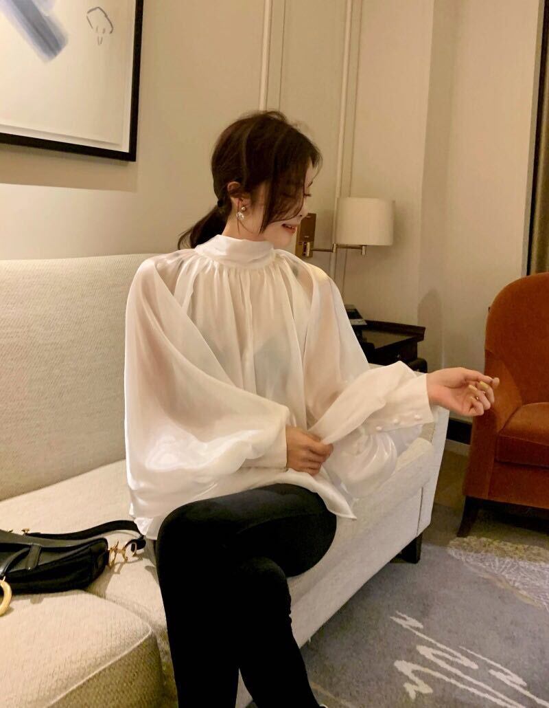 ブラウス トップス レディース シャツ ボリューム袖 ランタンスリーブ 長袖 ボトルネック ハイネック ラウンドネック 胸元ギャザー バックコンシャス 後ろリボン リボン付き 透け感 シースルー 艶素材 エレガント オフィス フォーマル 入学式 卒業式 入園式 卒園式 パーティー 結婚式 お祝い 大人女子 大人可愛い フレンチスタイル ペプラム やわらか ふんわり 体型カバー 二の腕カバー 長め丈 裾長め サテン風 単色 無地 春秋 白 黒 ホワイト ブラック ビッグシルエット きちんと感 モノトーン