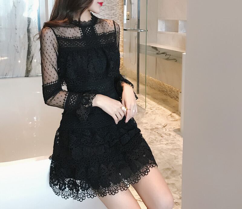 ワンピース ミニ丈 長袖 トランペットスリーブ ドレス dress オールシーズン パーティードレス パーティドレス 二次会ドレス 披露宴ドレス カラードレス ミニドレス ミニ かわいい ラウンドネック ハイネック Aライン レース フリル 大人可愛い 大人 上品 おしゃれ お洒落 ラブリー キュート ガーリー セクシー エレガント 主役級 存在感 ドット柄 水玉 20代 30代 美脚 脚長 高見え 格上げ 流行 インスタ映え 春 夏 秋 冬 結婚式 二次会 披露宴 S M L ブラック パープル