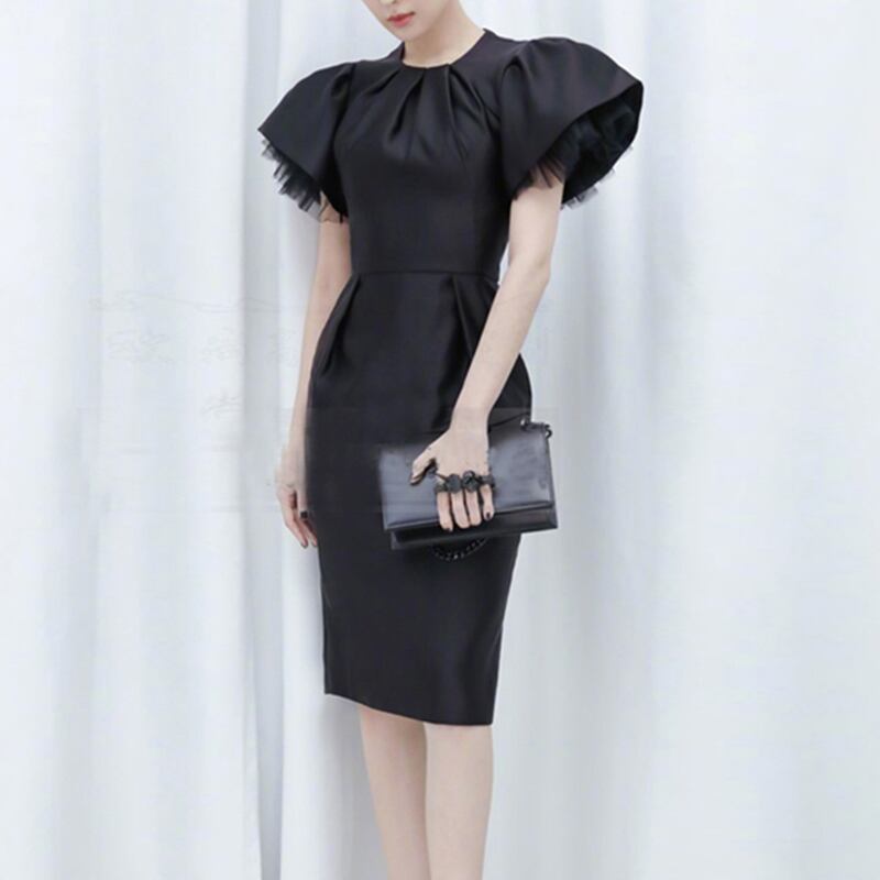 ドレス パーティードレス パーティドレス 二次会ドレス 披露宴ドレス 膝丈ドレス 膝丈 ひざ丈 ミディアム丈 ミディ丈 袖あり 半袖 フレアスリーブ ラウンドネック 襟なし Iライン タイト スリム ウエストマーク ハイウエスト シルクサテン 無地 20代 30代 40代 デート お出かけ パーティー イベント ホテル ガーデン レストラン ファッション コーデ スタイル オールシーズン シーズンレス 二次会 2次会 披露宴 お呼ばれ パーティXS S M L XL 2XL 3XL 黒 ブラック