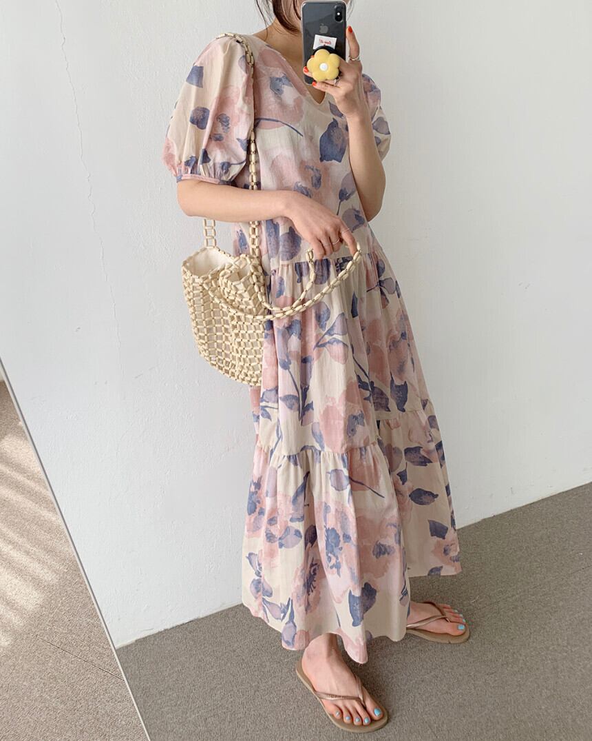 大判フラワープリント パフスリーブワンピース ロングドレス ロングワンピース 爽やか 淡い 儚い 花柄 落ち着きカラー イエロー ピンク 夏 ランタンスリーブ 半袖 Vネック 足長効果 華奢見せ ゆったり ラクチン ワンサイズ 人気 流行 女性 レディース 20・30代 女子 女の子 レディ 綺麗 可愛い カジュアル トレンド キュート おしゃれ モテ 女子力 おでかけ お散歩 動きやすい 買い物 友達 女子会 気分アップ デート 友達 お揃い 双子コーデ ハイファッション インスタ映え プレゼント