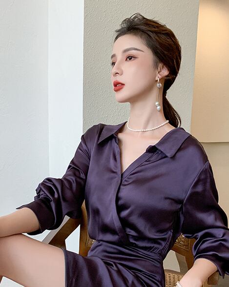 ワンピース レディース ワンピドレス ドレス きれいめ 紫 パープル ダークパープル 無地 襟付き ミニ丈 ミニ ミニスカート タイトスカート タイト 細身 Hライン 袖あり 袖タック タック 通勤 ファスナー フロントジップ ボタンドカフス ボタン ギャサー サイドギャザー 10代 20代 アシンメトリー ウエストマーク ウエスト 前開き シンプル 大人 上品 おしゃれ お洒落 大人女子 セクシー エレガント 存在感 主役級 デート お出かけ パーティー イベント モテ 切り替えデザイン 光沢 艶 つや