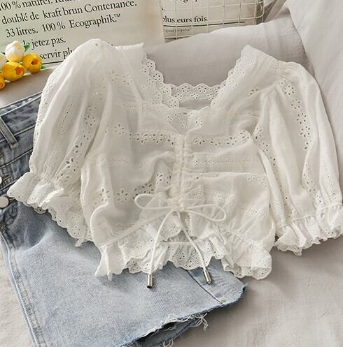 パフスリーブ トップ ショート丈 パンチングシースルー 人気デザイン ストリート カジュアル服 着回し おススメ 白 短い 大人 綺麗 インスタ映えランキング リボン シャーリング レースブラウス スーパーフェアリー ショートシャツ ホワイトカジュアル普段 夏 春夏女性用 お出かけ 旅行 普段着 大人女性 大人かわいい プチプラ インポート 海外ファッション お得 送料込み 休日 デート モテ 無地 サイズ ワンサイズ 女性用 ママ 女子会 合コン 綺麗め 上品 おしゃれ 清楚 クール こなれ感