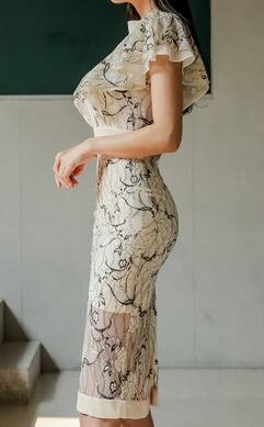 ワンピース レディース レース 透け感 タイトスカート ひざ丈 膝上 エレガント 20代 白 ホワイト ベージュホワイト 半袖 蓮の葉袖 ティアードスリーブ ハンカチーフスリーブ スタンドカラー ワンステップスカート 韓国系 フェミニン スリム タイト 細身 レース フリル ウエストマーク 透け感 シースルー かわいい 大人可愛い きれいめ 大人 上品 おしゃれ お洒落 大人女子 ガーリー セクシー エレガント ボタニカル 主役級 存在感 柄 結婚式 二次会 披露宴 デート お出かけ パーティー イベント