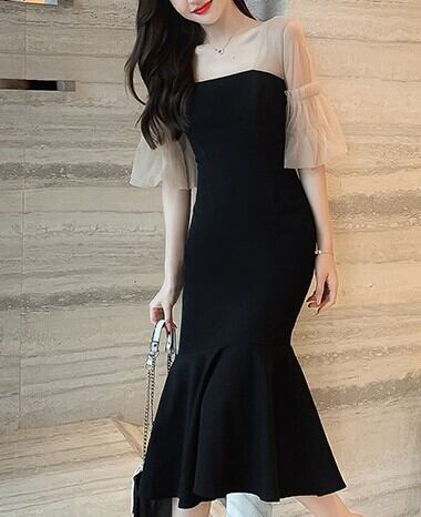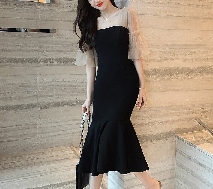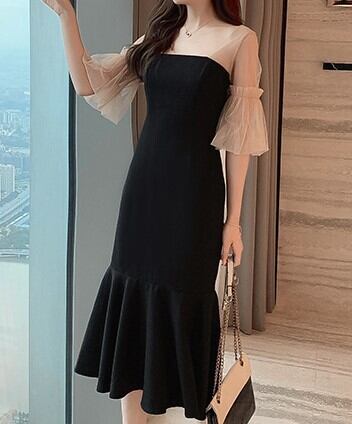 ミディ ワンピース マーメイド フリル レース切替 夏 新しい ニッチドレス ウエスト痩身 ドレス女性 ドレスタイトスカート 春夏女性用 ヒップスカート ミドル丈 ハーフスカート ミディ丈 アプリコット ブラック イベント パフ Vネック スタイリッシュ 主役級 大人綺麗 特別な日 ディナーリゾートお出かけ 旅行 大人女性 大人かわいい プチプラ インポート 海外ファッション お得 送料込み 休日 デート モテ 無地 女子会 合コン 綺麗め 上品 おしゃれ 清楚 クール ミディアム 丈 モード