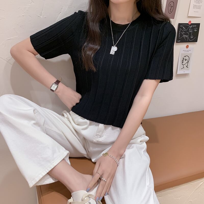 今年人気のショート丈の半袖ニットです。