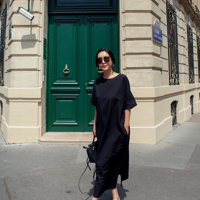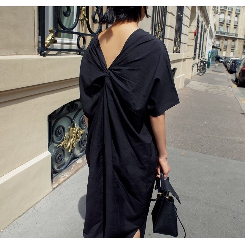 ワンピース レディース 女性用 Vネック オープンバック ミモレ丈 無地 袖あり 半袖 カジュアル ルーズ バットスリーブ スプリット ロングスカート ラウンドネック 20代 30代 40代 ママ マタニティ 母の日 誕生日 謝恩会 オフィス フォーマル 通勤 OL 通学 学生 お出かけ 休日 アウトドア 公園デビュー BBQ 旅行 お散歩 お泊まり 女子会 カフェ ショッピング イベント パーティー 旅行 トレンド 楽ちん 安定 夏 普段着 普段使い 体系カバー 定番 2020 ワンカラー ブラック