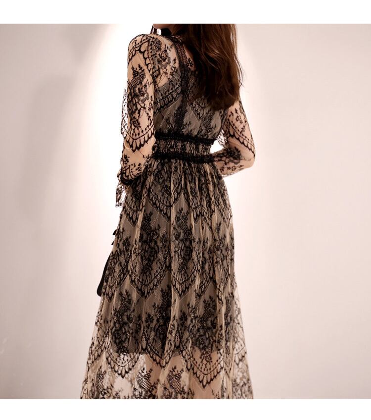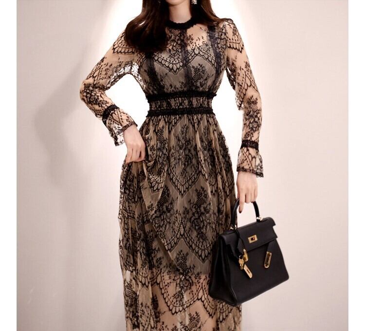 レースワンピース アンティーク調 レディース ロングワンピ 長袖ワンピース クラシック ヴィンテージ アンティーク調 ゴシック フレンチテイスト ワンピース 透け感 袖レース ベルスリーブ 黒レース ラウンドネック トレースデザイン 深め襟 襟トレース ウエストマーク ベルト風ウエスト 背中ジッパー フォーマル 食事会 女子会 お呼ばれ ナイトドレス ワンピドレス くるぶし丈 大人女子 上品 キャミソール付き 二の腕カバー ふんわりスカート ブラック ブラックドレス 主役級 一枚で決まる 韓国 高コスパ