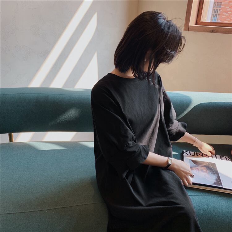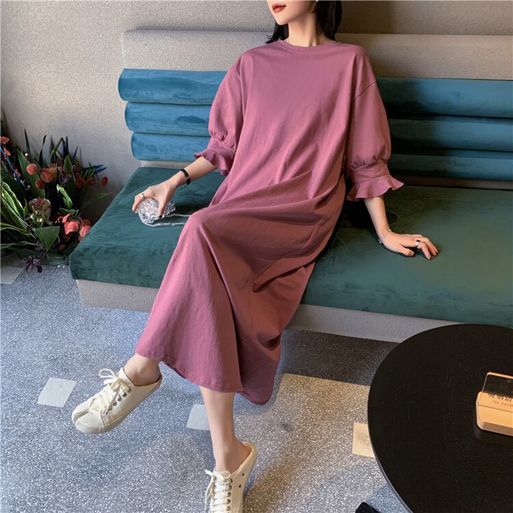 ワンピース レディース ロングスカート 袖あり 七分袖 ボリューム袖 クルーネック セミフレア Aライン 綿 ポリエステル かわいい 大人可愛い きれいめ シンプル カジュアル 大人 おしゃれ お洒落 大人可愛い 大人女子 こなれ感 ラフ ルーズ ブラック ピンク 無地 春 秋 2021 20代 30代 通勤 学生 デート お出かけ 公園デビュー 女子会 アウトドア 着回し 普段使い 韓国系 オルチャン ファッション コーデ スタイル 楽ちん モテ 体系カバー プレゼント 新作 流行 インスタ映え