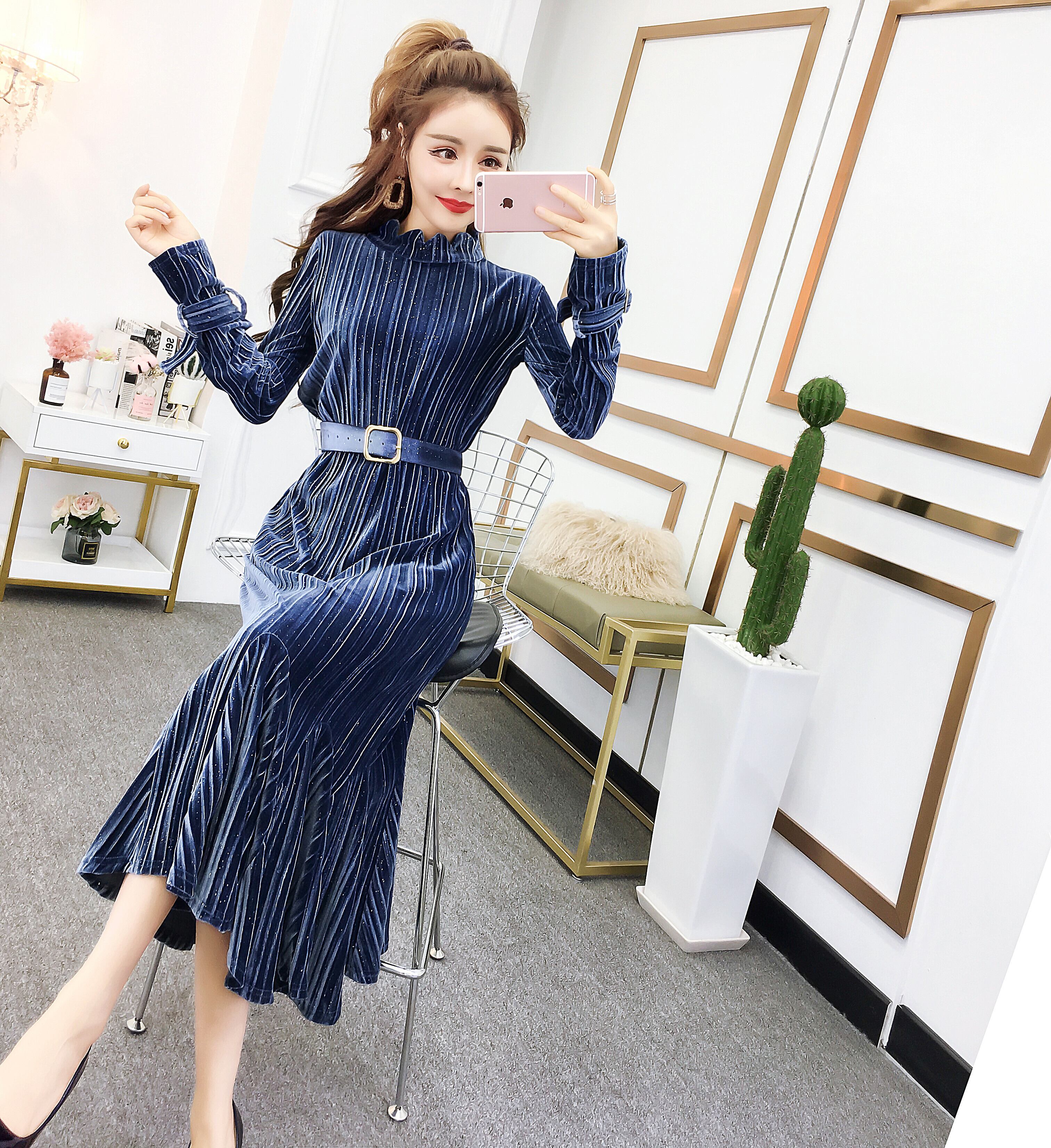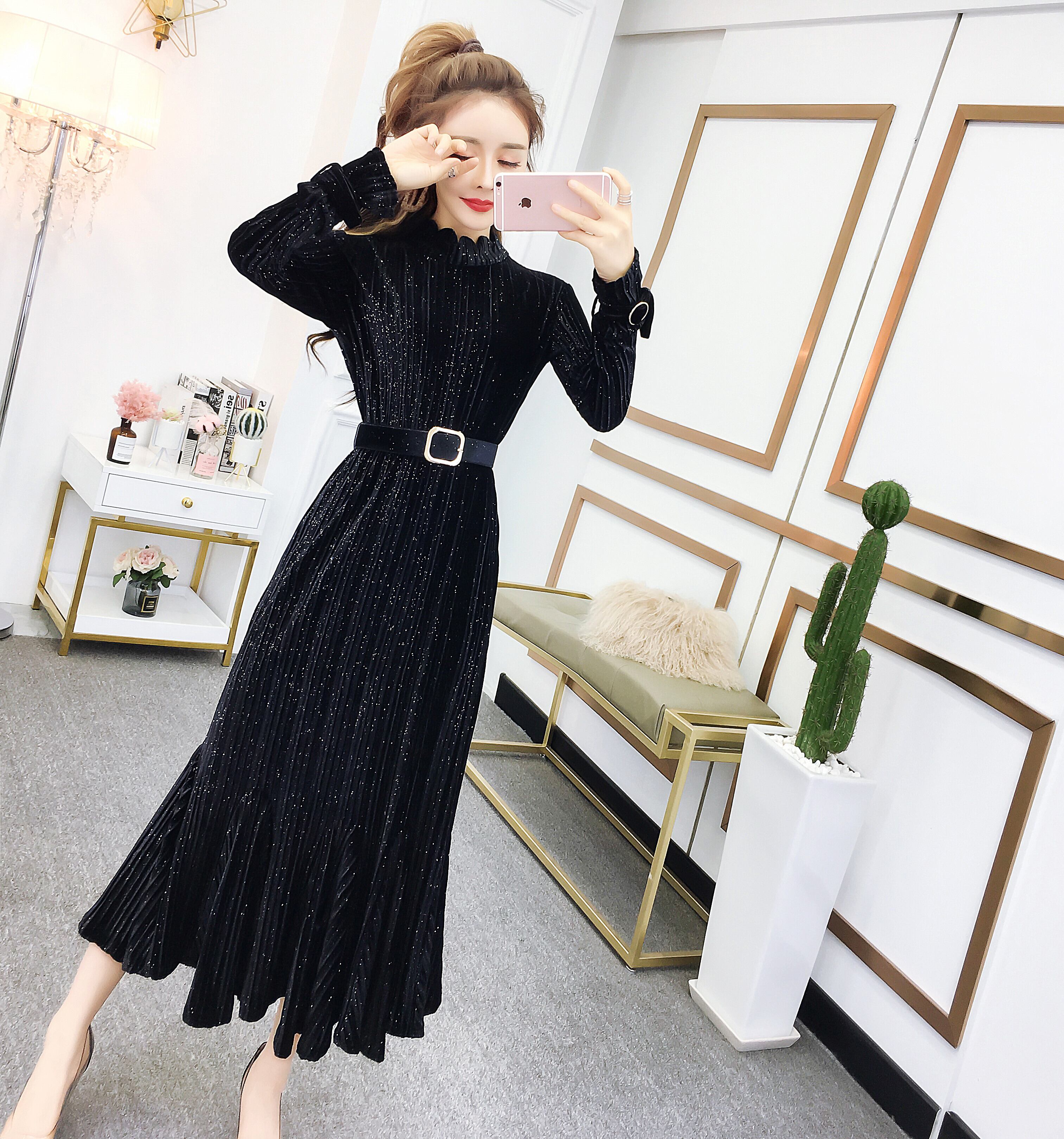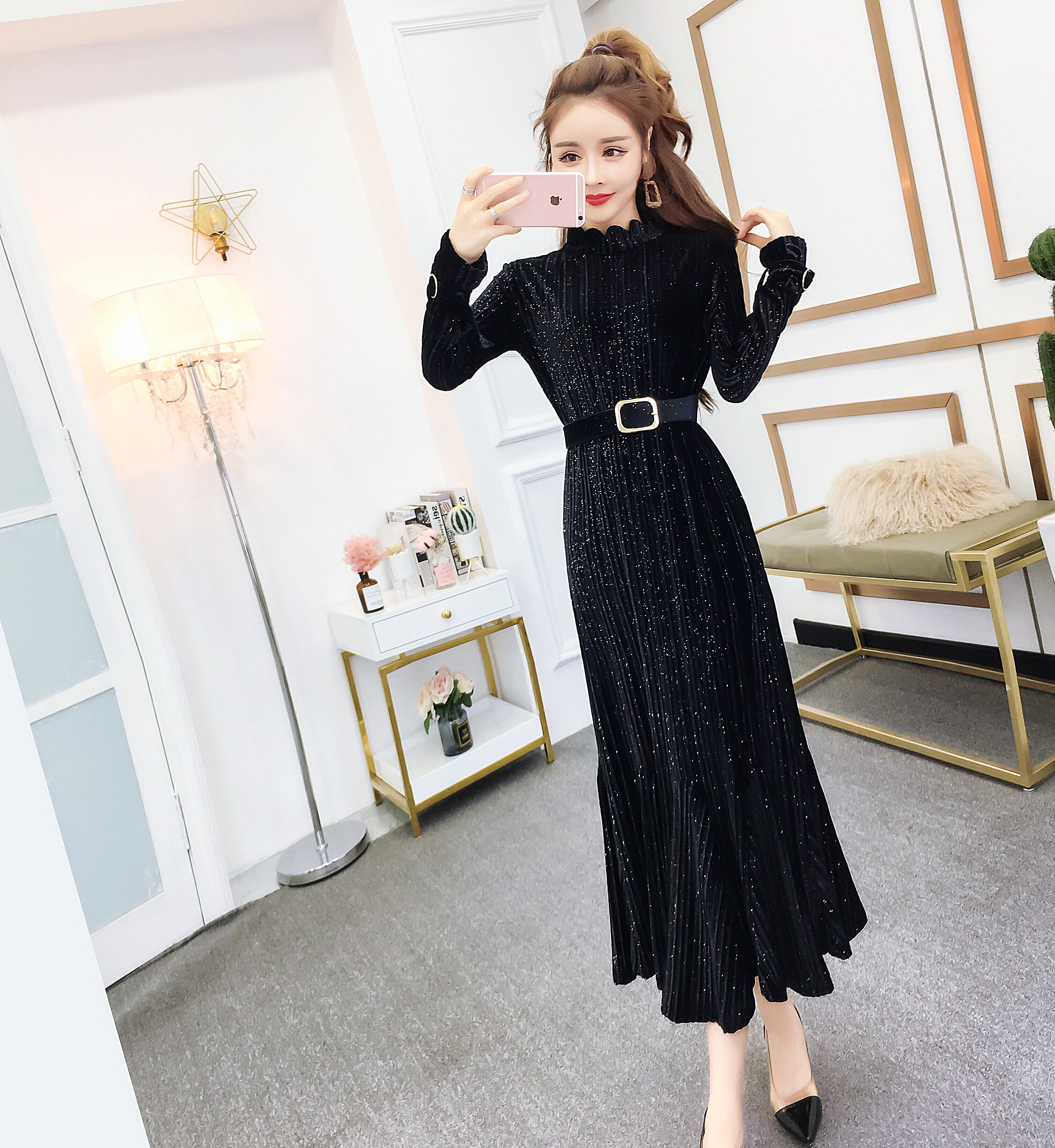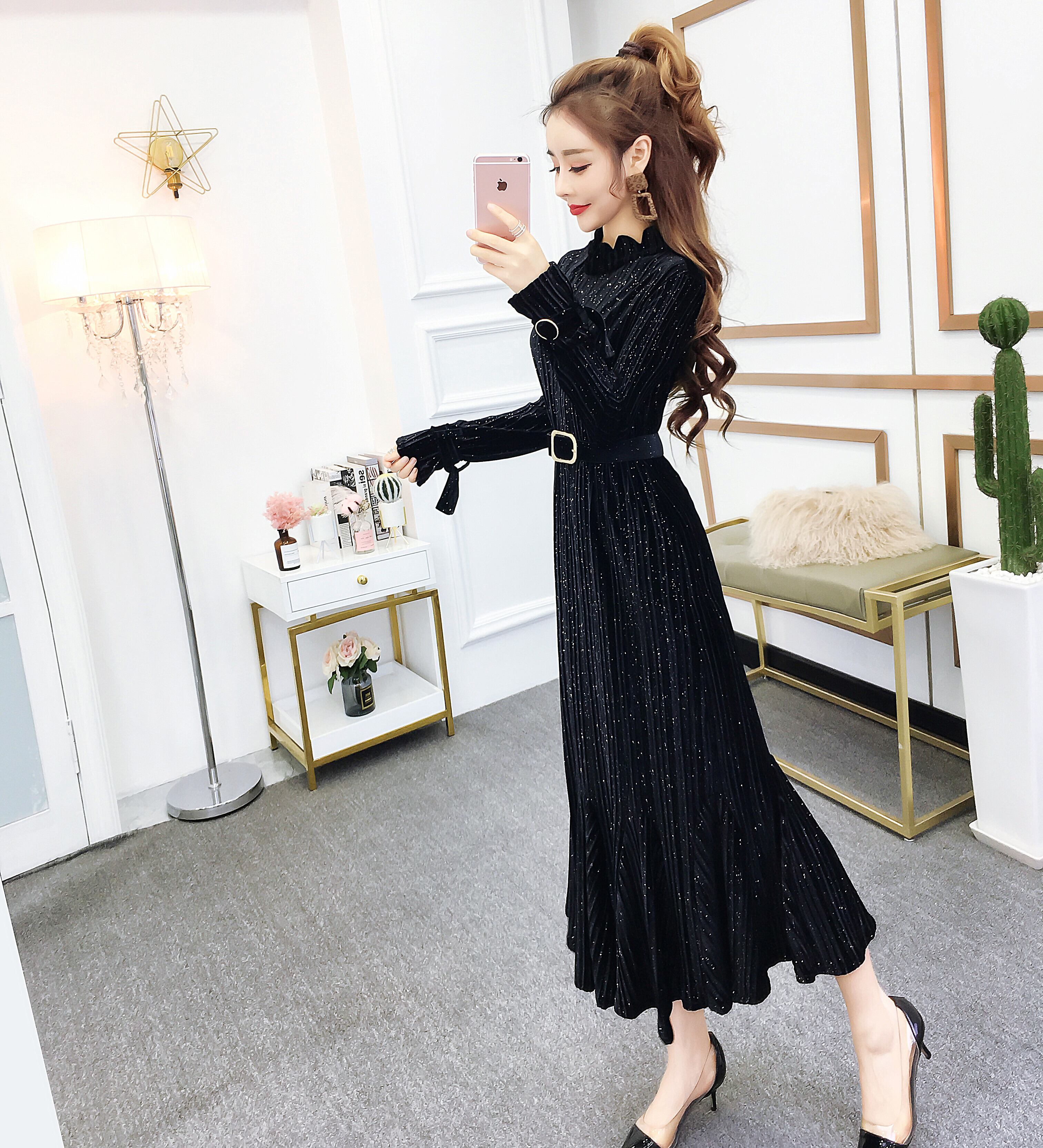 ワンピース レディース ワンピドレス 黒 ブラック 青 ブルー カーキ 光沢 メタリック きらきら ヴィクトリアン ベルベット プリーツ プリーツスカート アコーディオン ひらひら ロング ロング丈 裾フレア 袖あり 長袖 バックル スタンドカラー フリルスタンドカラー ストレート シャーリング ベルト ウエストマーク 大人可愛い 大人 上品 おしゃれ レトロ 大人女子 ガーリー エレガント サイズ豊富 大人カラー 無地 春 秋 結婚式 披露宴 デート お出かけ 女子会 休日 パーティー イベント