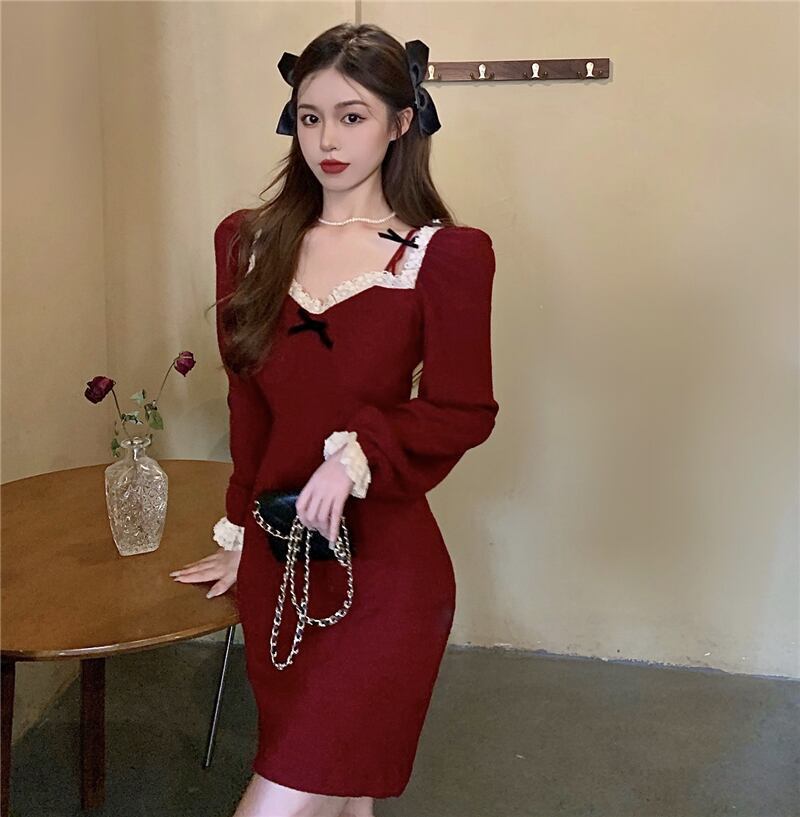 2ウェイデザイン ハートネック フロントダブルストラップ フリルレーストリミング 配色リボン装飾 マイクロミニ丈 足見せ ワンピース ミニ丈 ショート丈 膝上 長袖 オフショルダー スリム タイト 細身 レース リボン リブ 2way 伸縮性 ニット 異素材MIX かわいい 大人可愛い シンプル おしゃれ 大人女子 ガーリー キュート 個性的 セクシー 抜け感 無地 春 秋 レディース デート お出かけ 休日 韓国系 オルチャン ファッション コーデ 小さいサイズ 脚長 黒 ブラック 赤 レッド
