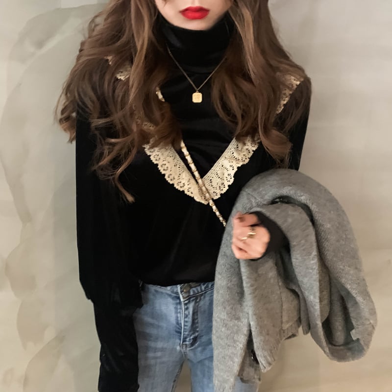 トップス レディースシャツ ブラウス ブラック ハイネック ゴールドベルベット ボトミングシャツ 海外デザイン レトロ レース ステッチ パフスリーブ スリム シャツトップ フリル かわいい 大人可愛い きれいめ カジュアル おしゃれ お洒落 大人 大人女子 ラブリー キュート ガーリー 個性的 無地 20代 30代 学生 通学 デート お出かけ 公園デビュー 女子会 旅行 着回し 普段使い 韓国 韓国系 オルチャン ファッション コーデ スタイル モテ 新作 プチプラ トレンド 流行 インスタ映え