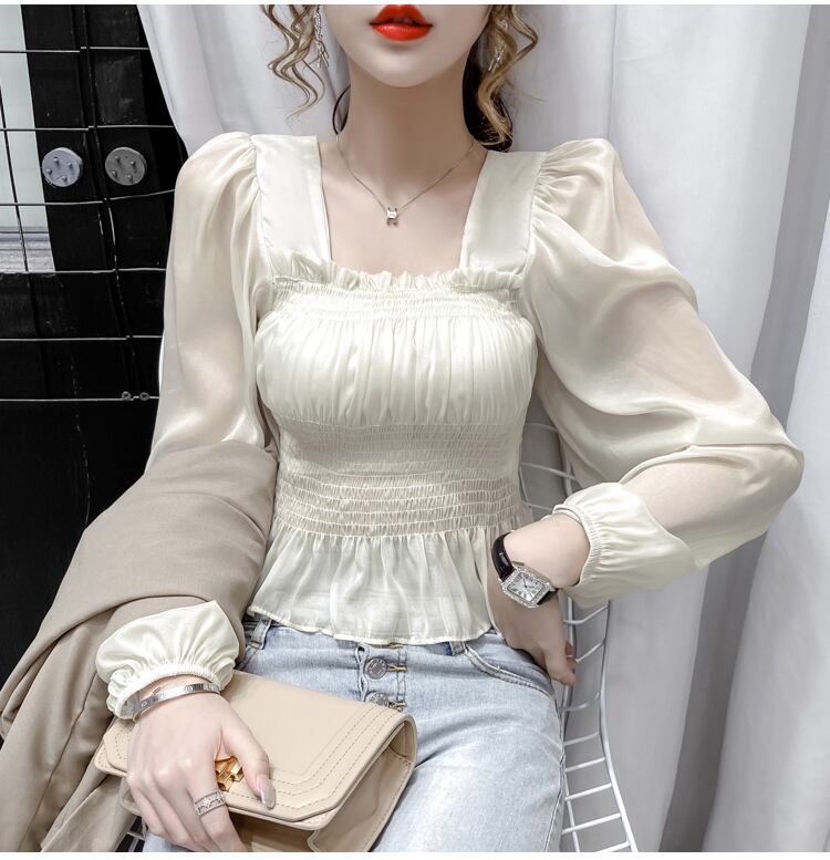 トップス レディース ブラウス シャツ 白シャツ 白トップス 白 ホワイト アプリコット ニュアンスカラー 光沢 無地 袖あり 長袖 ボリューム袖 パフスリーブ バブルスリーブ スクエアネック シャーリング ギャザー フリル 異素材MIX 光沢 ツヤ 艶 ニュアンスカラー かわいい 大人可愛い きれいめ シンプル 大人 上品 おしゃれ お洒落 大人女子 こなれ感 ラブリー キュート ガーリー セクシー エレガント とろみ感 ゆったり 通勤 学生 通学 デート お出かけ 女子会 休日 パーティー イベント