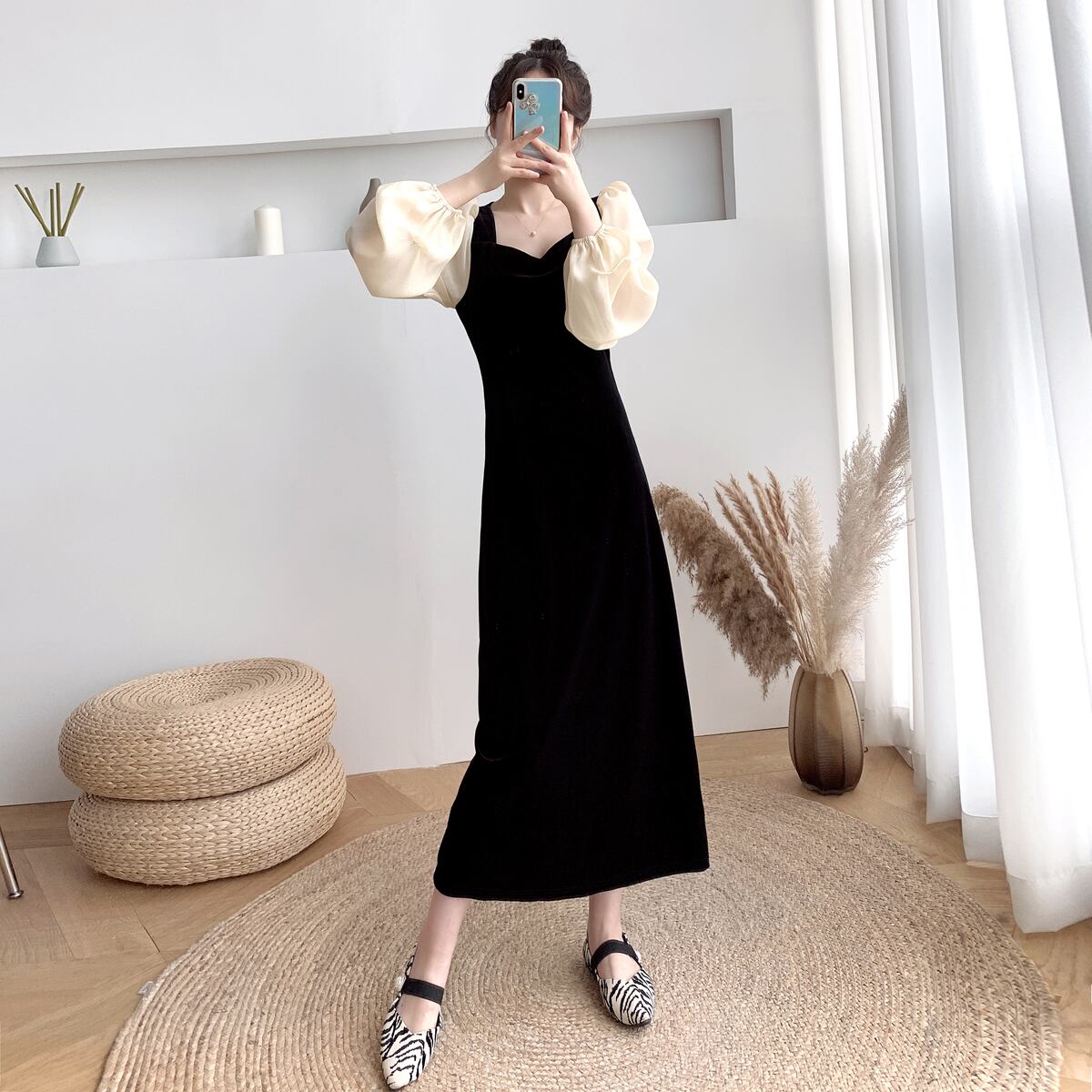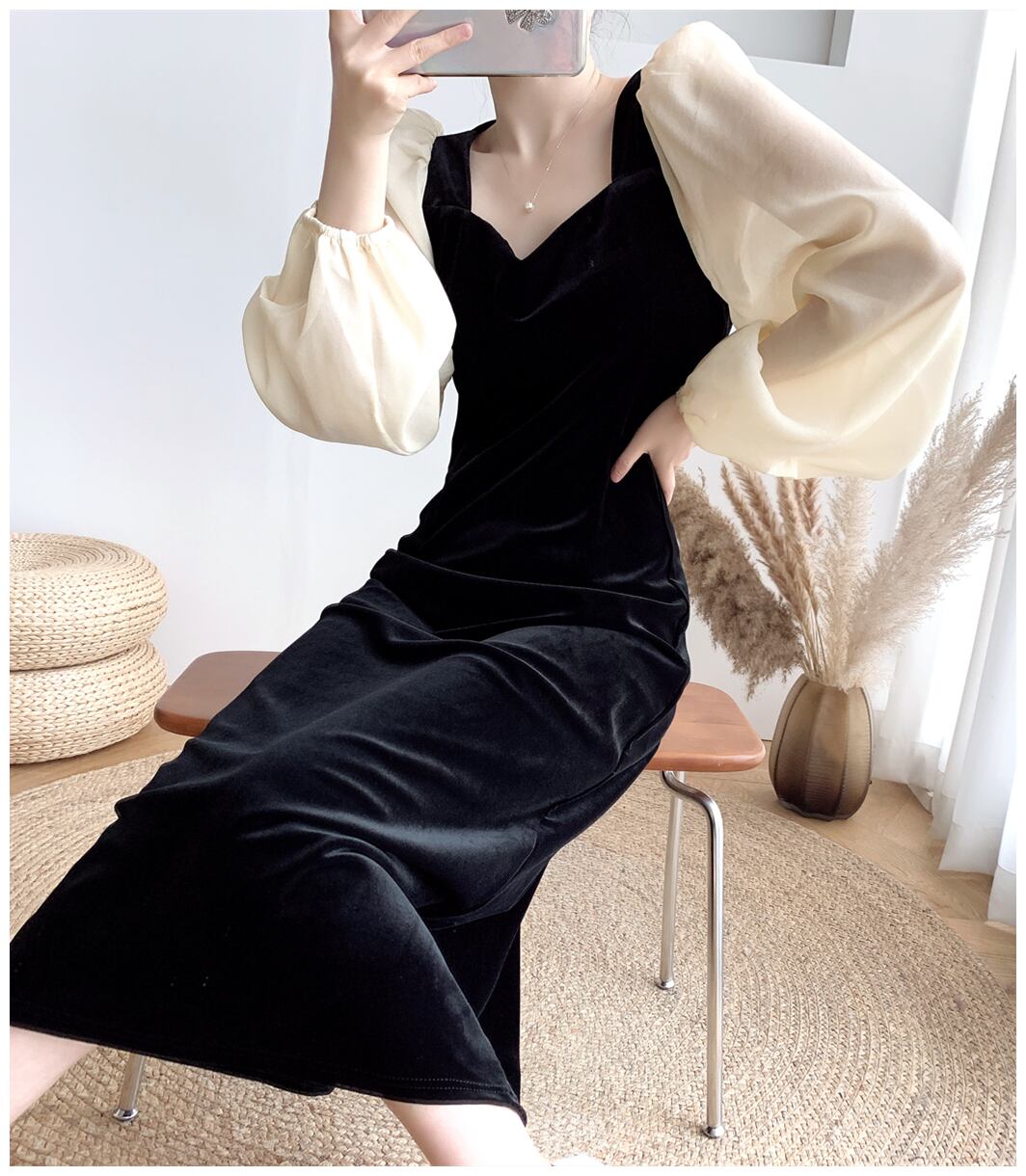 ワンピース レディース ワンピドレス フェイクワンピース ロング ロング丈 長袖 ボリューム袖 パフスリーブ バブルスリーブ ペザントスリーブ ビショップスリーブ 襟なし 黒 モノトーン ブラック スリム 細身 ストレート 切り替えデザイン 異素材MIX 光沢 バックスリット ベルベット ファスナー かわいい 大人可愛い きれいめ シンプル 大人 上品 おしゃれ 大人女子 クール セクシー エレガント とろみ感 ゆったり 結婚式 披露宴 二次会 通学 デート お出かけ 女子会 パーティー イベント