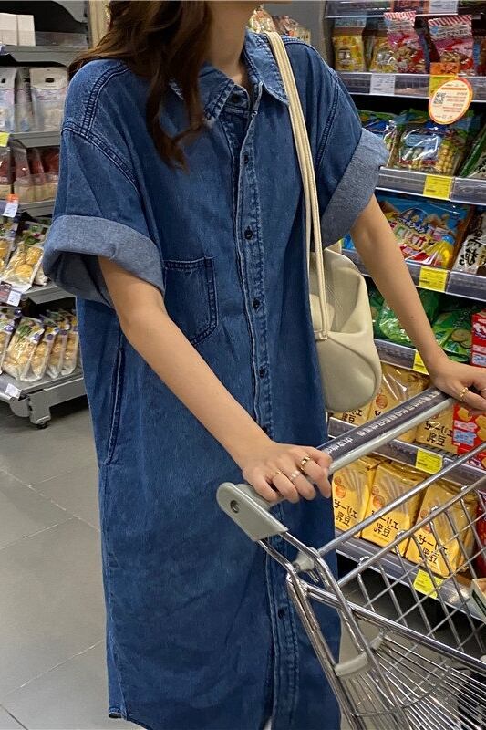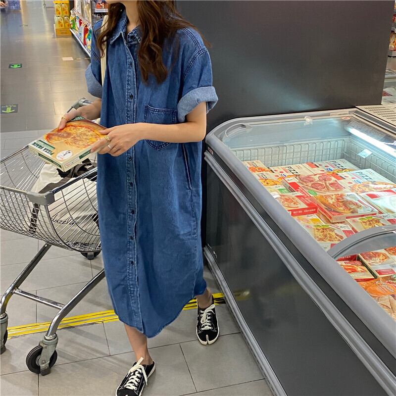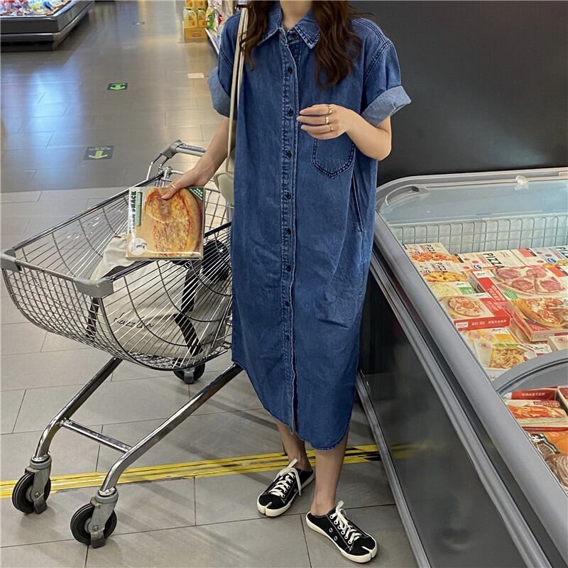 ワンピース レディース デニムワンピース 前開き かわいい シンプル カジュアル おしゃれ ラフ スポーティー イベント 旅行 買い物 ショッピング ドライブ 海 プール 楽ちん ファッション コーデ スタイル 普段使い 着回し 無地 夏 アウトドア 休日 女子会 お出かけ デート 学生 通学 OL 通勤 10代 20代 青 ブルー ゆる ゆったり 大きめ フリーサイズ メンズライク ミモレ ミモレ丈 ロング ロング丈 ミディアム丈 袖あり 半袖 襟付き ストレート 胸ポケット ブルーデニム デニム