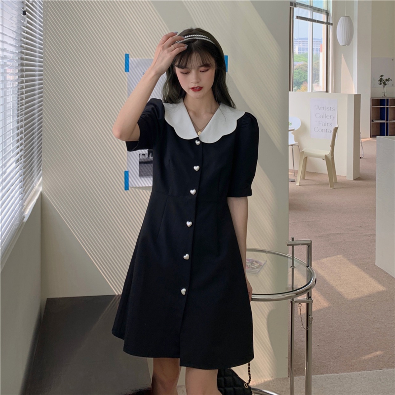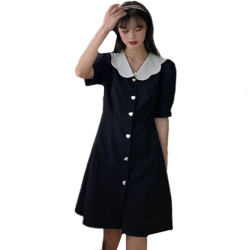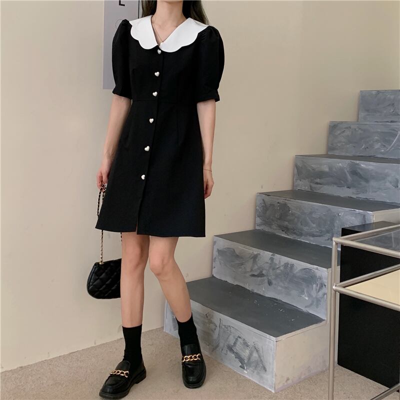 ワンピース レディース ミニスカート ミニ ミニ丈 ショート ショート丈 黒 ブラック 無地 モノトーン 袖あり 半袖 パフスリーブ バブルスリーブ 襟付き ビッグカラー ドールカラー ハイウエスト Aライン ボタン 金ボタン ハート ボタンダウン シングルボタン 前開き かわいい 大人可愛い カジュアル シンプル おしゃれ お洒落 レトロ ラブリー キュート ガーリー お人形 ドール 誕生日 披露宴 二次会 結婚式 学生 通学 デート お出かけ 女子会 休日 パーティー イベント モテ 普段使い