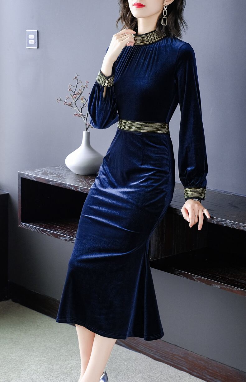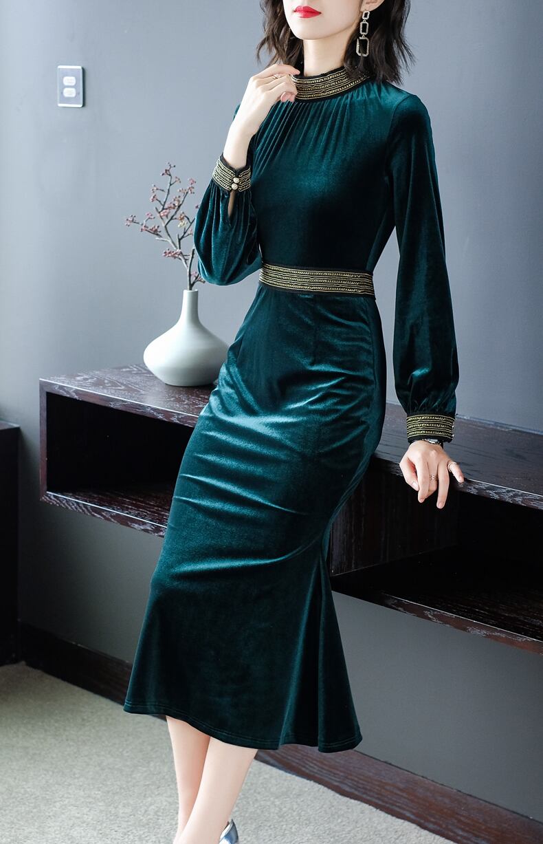 ワンピース レディース ワンピドレス 膝下 ミモレ ミモレ丈 ロング ロング丈 無地 光沢 艶 黒 ブラック 緑 グリーン 紫 パープル 濃紺 ダークブルー カラバリ 袖あり 長袖 襟付き スタンドカラー スリム タイト 細身 マーメイド 裾フレア ウエストマーク パイピングカフス ボタン ループボタン シャーリング ギャザー 大人可愛い 大人女子 きれいめ シンプル 大人 上品 おしゃれ お洒落 エレガント フォーマル 結婚式 二次会 披露宴 20代 30代 デート お出かけ 休日 パーティー イベント