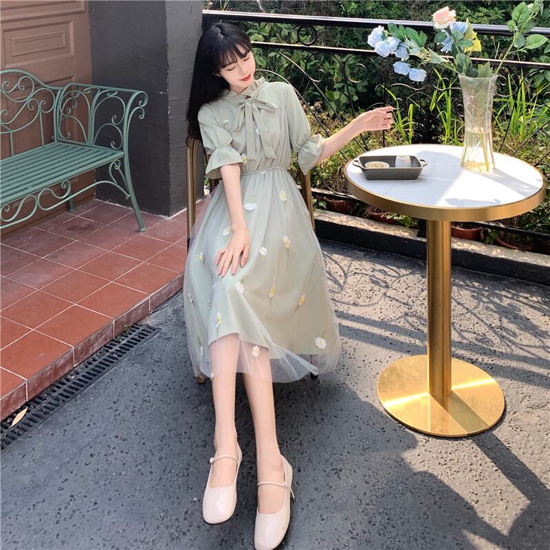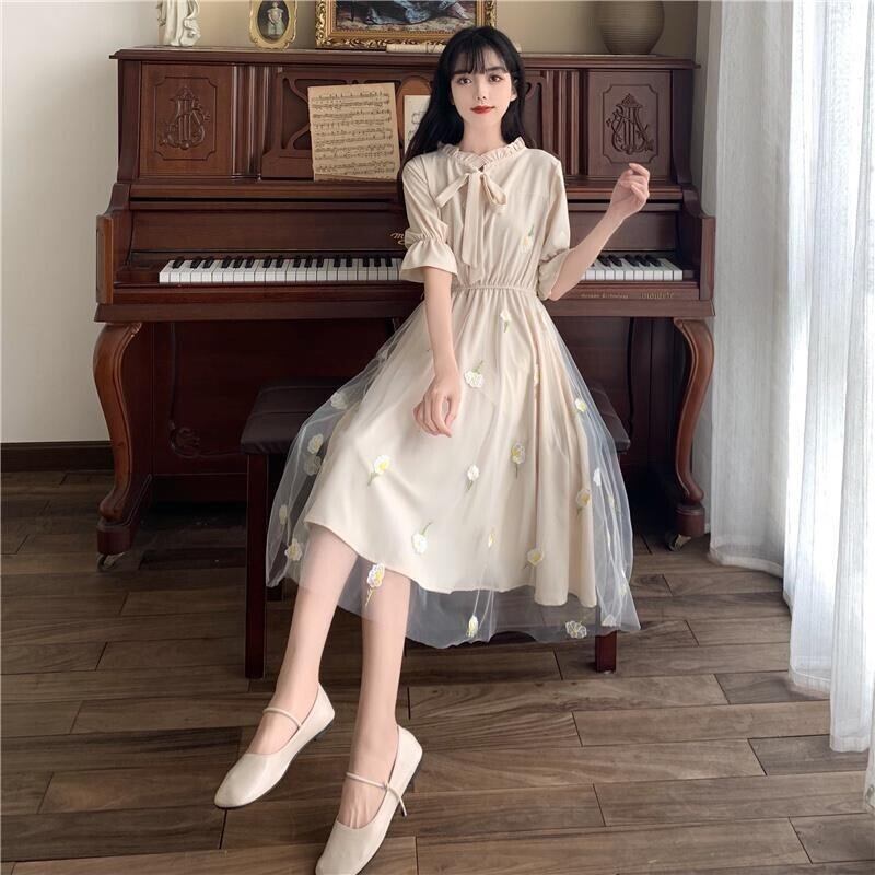 ワンピース レディース チュールワンピース ラフ ラブリー キュート ガーリー 体系カバー 楽ちん モテ スタイル コーデ 韓国系 普段使い 着回し デート 旅行 リゾート イベント アウトドア 休日 女子会 お出かけ OL 通勤 学生 通学 夏 10代 20代 赤 アプリコット 緑 グリーン ふんわり きれいめ おしゃれ 大人上品 かわいい ラウンドネック 裾フレア ギャザー 襟あり 袖あり 5分袖 パフスリーブ チュール ハイウエスト 花柄 大人かわいい フリルカラー Aライン レディライク