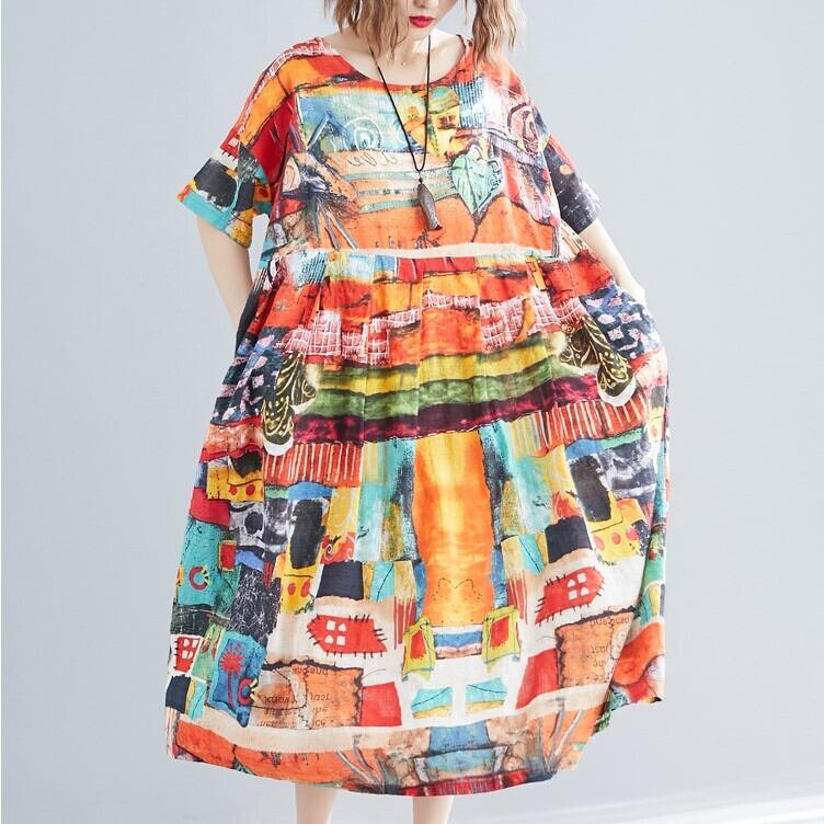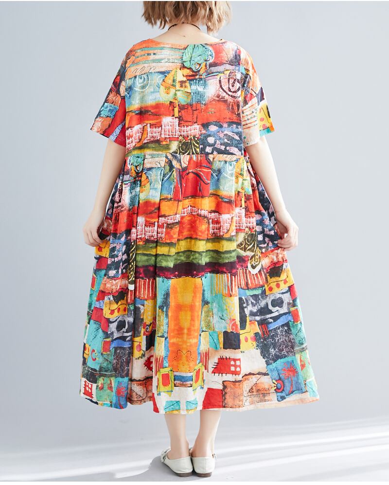 プリントドレス ワンピース レディース ワンピドレス カラフル ロング Aライン 大き目 ゆったり カジュアル お出かけ 人気 ラフ のんびり ビックアップリケ デザイン ストリート 体型カバー Uネック プリント ファッショナブル インポート ファッション ロング丈 カバー ストレート 裾フレア 切り替えデザイン ハイウエスト 大人可愛い 大人 大人女子 きれいめ おしゃれ お洒落 ラブリー キュート ガーリー 10代 20代 30代 学生 デート 女子会 休日 イベント 存在感 パーティー