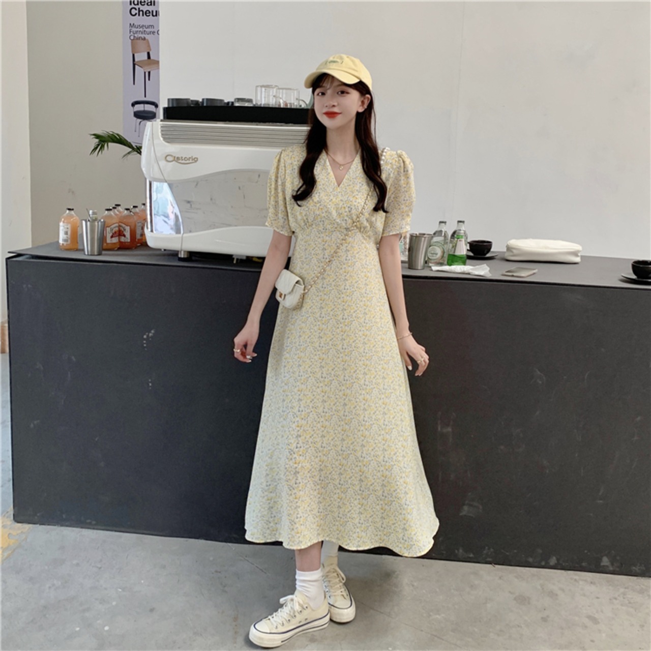 ワンピース レディース ロングワンピース ロング丈 袖あり カジュアル 半袖 Vネック 襟なし フレア Aライン シフォン ハイウエスト キュート かわいい シンプル 大人可愛い きれいめ おしゃれ ガーリー オレンジ イエロー ブルー パステルカラー 小花柄 プリント 夏 10代 20代 オフィス OL 通勤 学生 通学 デート お出かけ 女子会 休日 アウトドア パーティー 旅行 海 プール リゾート 着回し 普段使い 楽ちん モテ 体系カバー オルチャン こなれ感 カジュアルv主役級 バックリボン