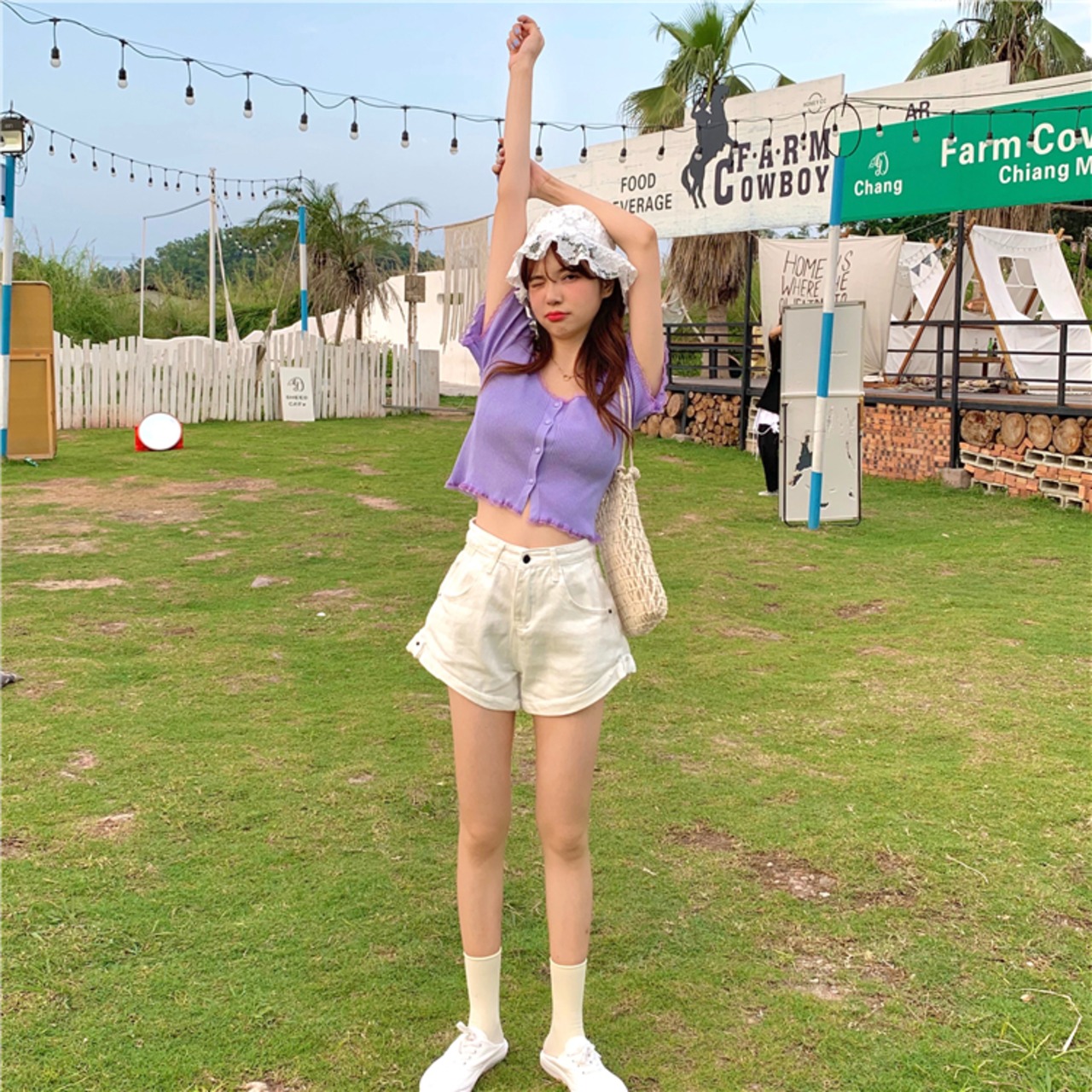 トップス レディース カットソー ショート丈 袖あり 半袖 ラウンドネック 細身 フリル 前開き 伸縮性 かわいい 大人可愛い シンプル おしゃれ お洒落 ラブリー キュート ガーリー ワンサイズ 白 ホワイト 黒 ブラック 青 ブルー 紫 パープル くすみカラー 無地 春 夏 2021 20代 30代 女の子 通勤 学生 通学 デート お出かけ 公園デビュー 女子会 リゾート 着回し 韓国 韓国系 オルチャン ファッション コーデ スタイル モテ 新作 プチプラ トレンド 流行 インスタ映え