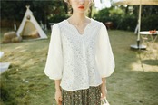 トップス レディース 白シャツ ブラウス プルオーバー 袖あり 7分袖 七分袖 ボリューム袖 パフスリーブ 襟なし 白 ホワイト 柄 リーフ柄 ボタニカル 刺繍 透け感 シースルー かわいい 大人可愛い 大人 大人女子 きれいめ おしゃれ お洒落 シンプル ラブリー キュート ガーリー 10代 20代 30代 学生 通学 デート お出かけ 女子会 休日 イベント 普段使い カジュアル こなれ感 ラフ ルーズ 抜け感 ゆったり ゆる 上品 エレガント 夏 楽ちん リゾート 旅行 海 プール 重ね着 モテ