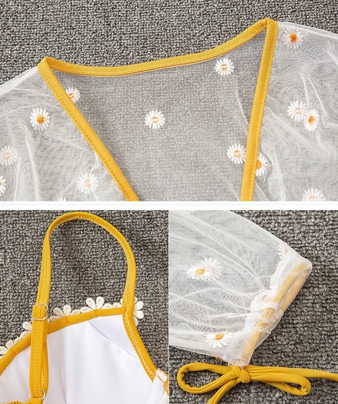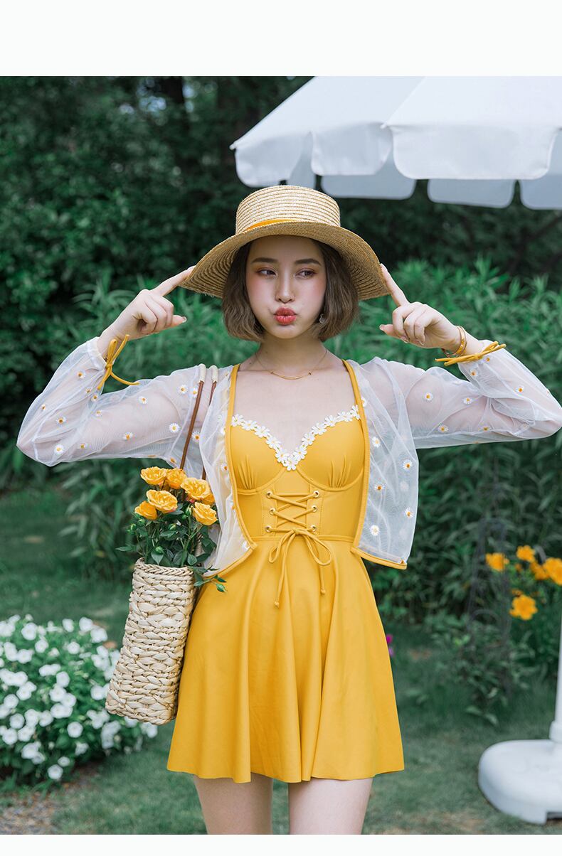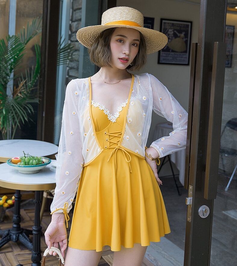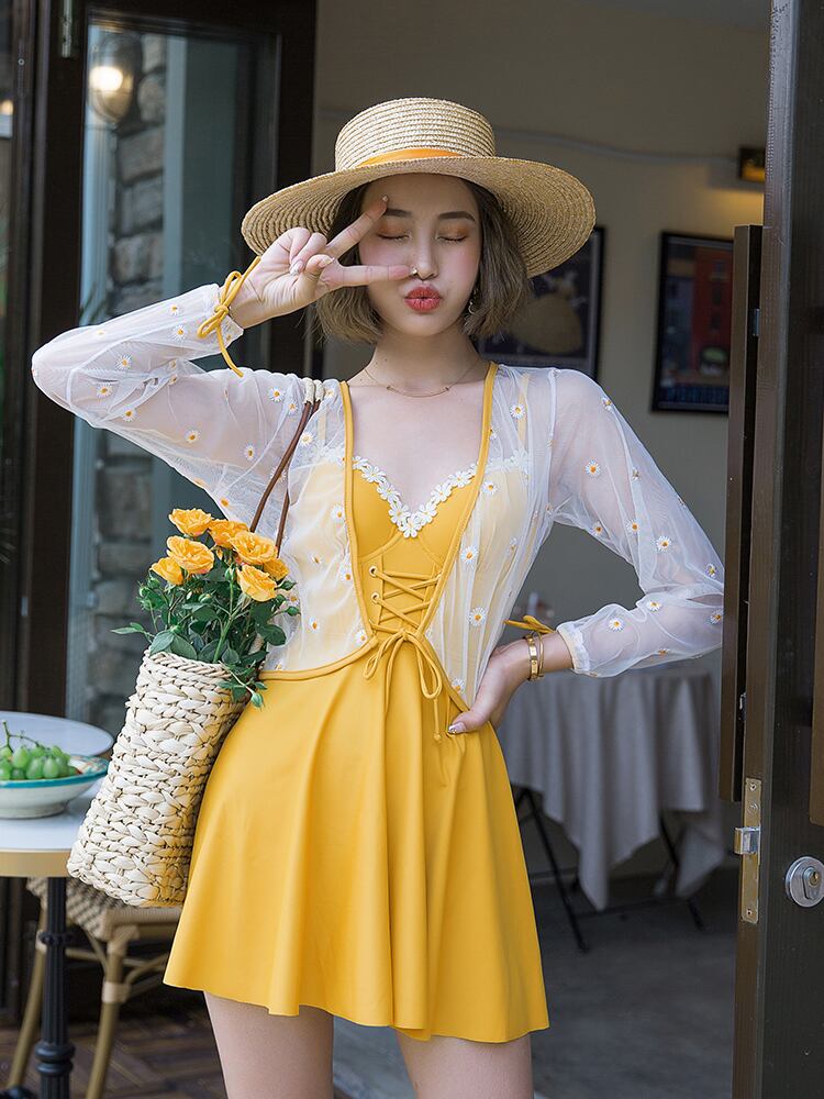 水着 レディース キャミソール フレアスカート ショートパンツ ショート丈 カーディガン 袖あり 長袖 Vネック 襟なし Aライン レース 編み込み 刺繍 胸パッド 4点セット かわいい カジュアル ラブリー キュート ガーリー おしゃれ イエロー 無地 小花柄 透け感 シースルー ビビッドカラー 夏 10代 20代 OL 学生 デート お出かけ イベント リゾート 旅行 海 プール 韓国系 オルチャン ファッション 楽ちん モテ 体系カバー インスタ映え スタイル フラワー こなれ感 スポーティー