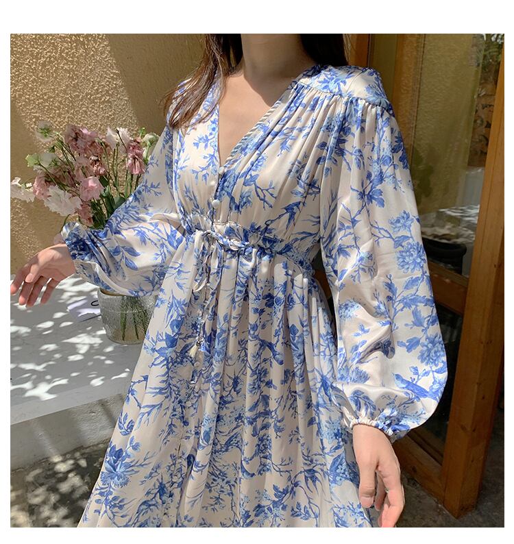 ワンピース レディース ワンピドレス フレアワンピース ロング丈 袖あり 長袖 ボリューム袖 Vネック 襟なし Aライン シフォン ウエストマーク スリット ウエストリボン 伸縮性 ハイウエスト かわいい 大人可愛い きれいめ 上品 おしゃれ 大人女子 こなれ感 ラフ キュート エレガント とろみ感 ゆったり ブルー 花柄 フラワー プリント ギャザー 10代 20代 30代 マタニティ OL 学生 通学 デート お出かけ イベント リゾート 旅行 海 着回し 普段使い ファッション 楽ちん モテ