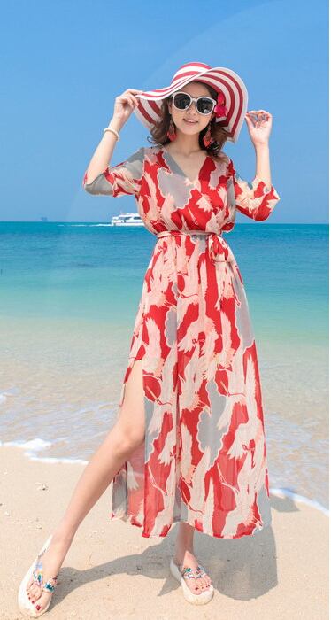 ワンピース レディース ワンピドレス フレアスカート ミモレ ミモレ丈 袖あり 7分袖 七分袖 Vネック 赤 レッド 柄 花柄 フラワー ボタニカル シフォン ひらひら 透け感 シースルー ウエストマーク ウエストリボン リボン 薄手 夏 かわいい 大人可愛い 大人 大人女子 きれいめ おしゃれ お洒落 ラブリー キュート ガーリー 10代 20代 30代 学生 デート お出かけ 女子会 休日 イベント 普段使い カジュアル こなれ感 エレガント セクシー フォーマル 結婚式 二次会 披露宴 パーティー