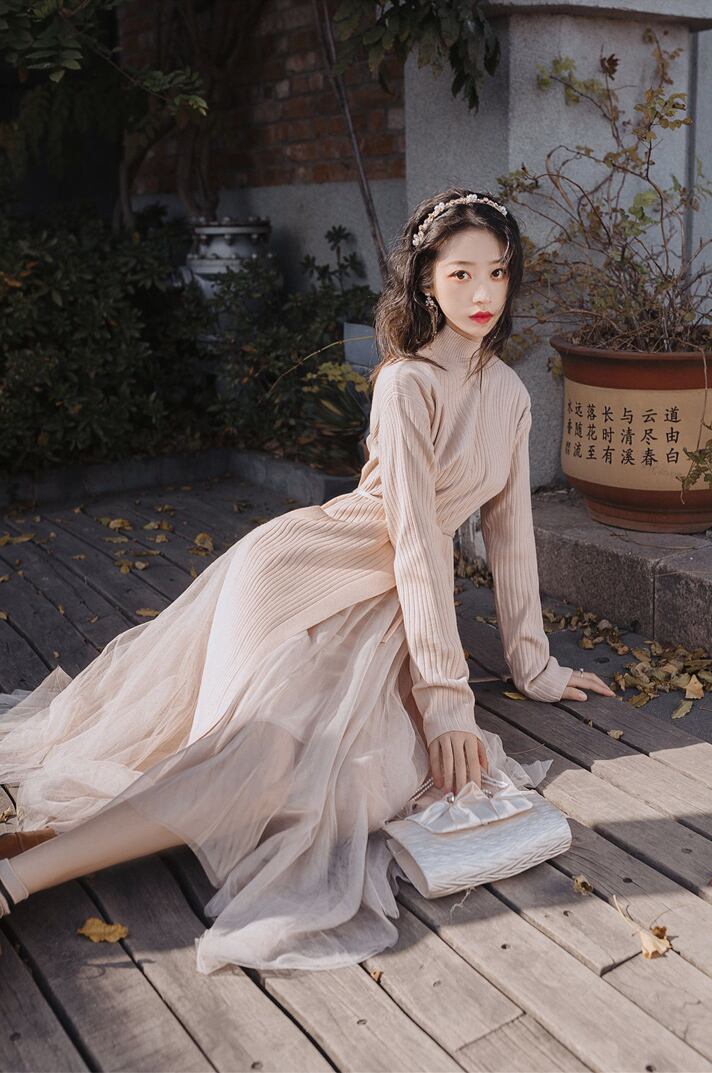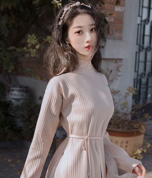 ロングワンピース ハイネック 長袖 ニット セーター レディース ツーピース ロングスカート アプリコット ベージュ ホワイト 全3サイズ S M L ふわふわ 可愛い カワイイ エレガント カジュアル こなれ感 韓国 韓国風 フランス 外国風 オルチャン きれいめ 大人 上品 おしゃれ 大人可愛い 大人女子 10代 20代 30代 40代 50代 春 秋 冬 普段着 普段遣い ロング丈 ミモレ丈 フェミニン キュート ガーリー 透け感 ヌケ感 無地 萌え袖 アシンメトリー ウエストベルト ひらひら