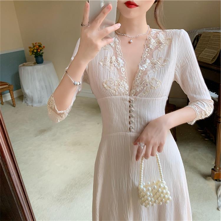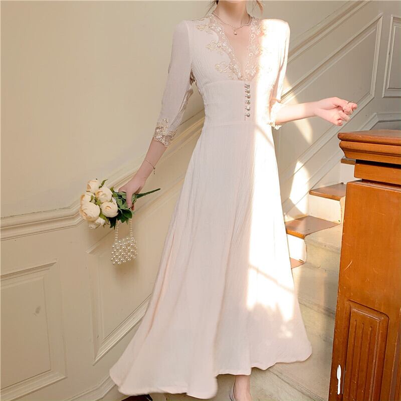 ワンピース レディース 女性用 Vネック レース ロング マキシ フレア 7分丈 無地 ハイウェスト シフォン ミドル丈 ワンサイズ ワンカラー ホワイト パーティースタイル 大人女子 大人可愛い エレガント 存在感 主役級 キュート ラブリー ガーリー フォーマル きれいめ 上品 アジアン 20代 30代 OL 学生 謝恩会 二次会 結婚式 披露宴 誕生日 入学式 卒業式 入園式 バレンタイン 休日 お出かけ イベント 女子会 モテ トレンド 体系カバー インスタ映え オールシーズン 双子 おしゃれ