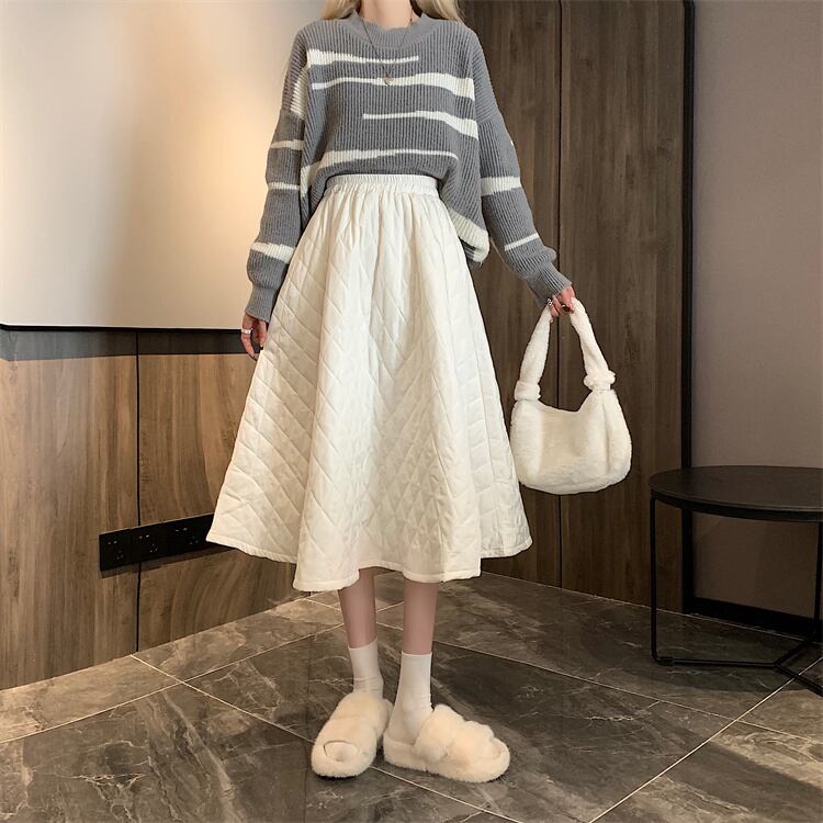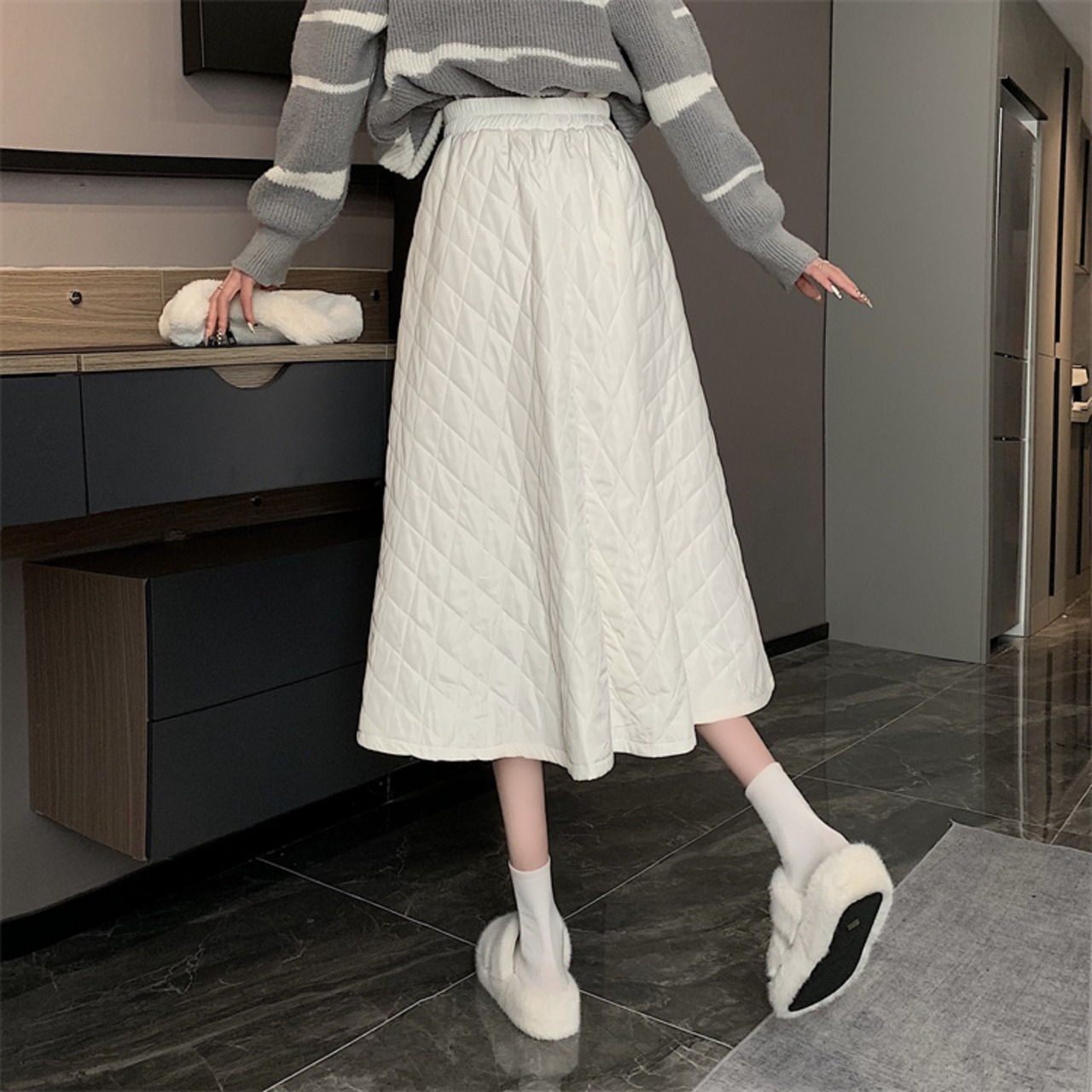 スカート ミモレ丈 モノトーン 白 ホワイト 黒 ブラック 無地 キルティング ミモレ Aライン ウエストゴム 伸縮性 厚手 菱形 もこもこ モコモコ かわいい 大人可愛い レディース 大人 大人女子 きれいめ おしゃれ お洒落 シンプル ラブリー キュート ガーリー フェミニン 10代 20代 30代 通勤 学生 通学 デート お出かけ 女子会 休日 普段使い カジュアル 防寒 暖かい あったか こなれ感 ラフ ルーズ 抜け感 とろみ感 ゆったり ゆる パーティー イベント アウトドア 着回し 楽ちん