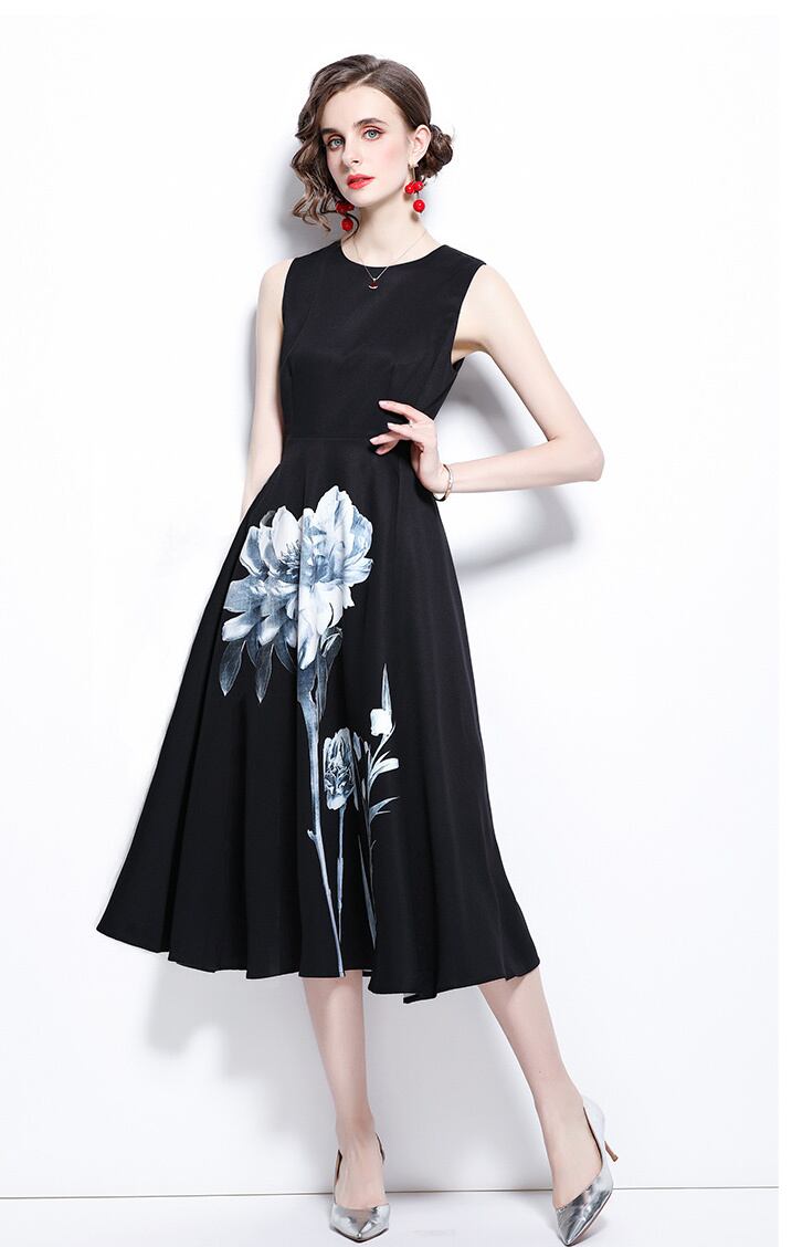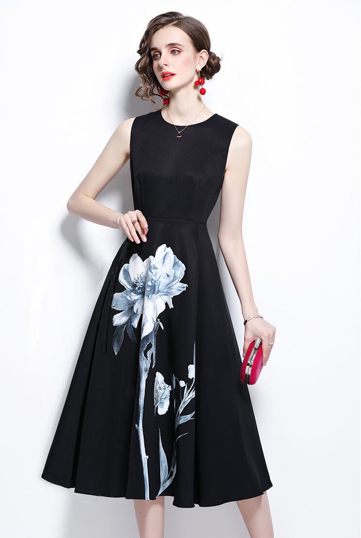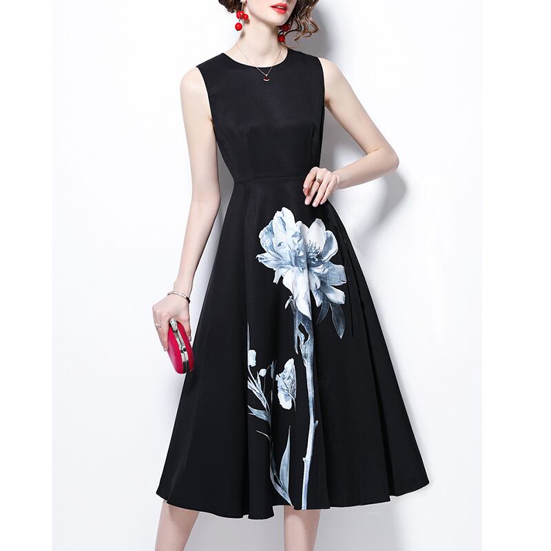 Aライン フラワー ワンピース ドレス ノースリーブ ラウンドネック 花柄 結婚式 レディース ひざ丈 膝丈 ミドル丈 ブラック 黒 全5サイズ S M L XL 2XL パーティー エレガント フォーマル オールシーズン 韓国 韓国風 きれいめ 大人 上品 おしゃれ 大人可愛い 大人女子 セクシー 10代 20代 30代 40代 50代 60代 イベント 主役級 存在感 二次会 謝恩会 シーズンレス 誕生日 披露宴 美脚 脚長 インスタ映え 大きいサイズ お呼ばれ シック セレブ 切り替えデザイン