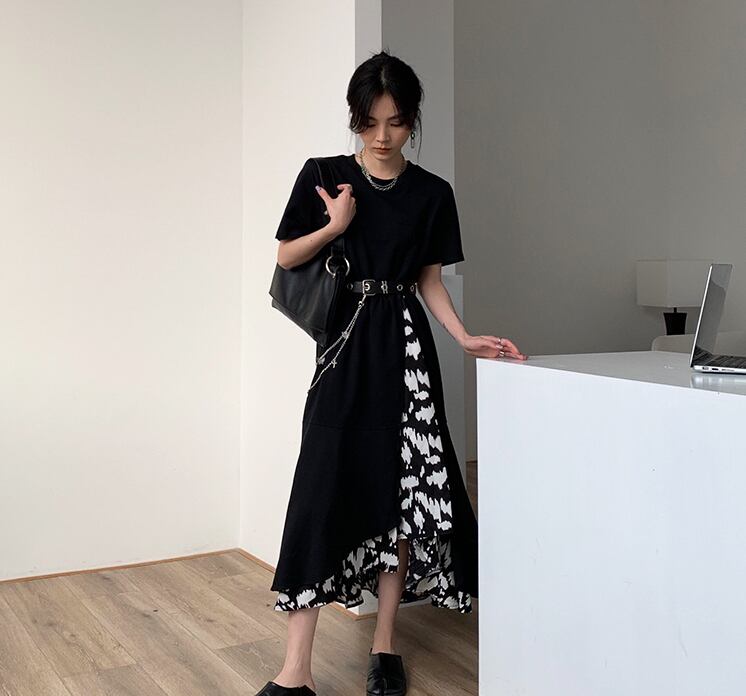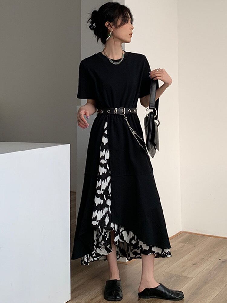 ロングワンピース 半袖 ラウンドネック Aラインワンピース レディース ブラック 黒 全6サイズ M L XL 2XL 3XL 4XL 大きいサイズ カッコいい クール シック セクシー 韓国 韓国風 大人 上品 おしゃれ 大人可愛い 大人女子 10代 20代 30代 40代 50代 60代 春 夏 秋 美脚 脚長 普段着 デート 旅行 女子会 リゾート ハイウエスト ミドル丈 存在感 エレガント 個性的 アシンメトリー レトロ 柄 ロング丈 二の腕カバー きれいめ マニッシュ モード系 ルーズ モダン