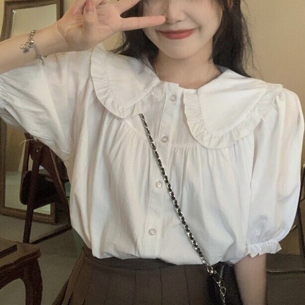 半袖 シャツ フレンチ ブラウス パフスリーブホワイトブラウス夏 襟 白いシャツ 女性 デザイン ニッチ ラウンドネック 襟付きフリル ギャザー キュート ガーリー 体系カバー 楽ちん モテ スタイル コーデ 韓国系 普段使い 着回し デート 海 旅行 リゾート イベント アウトドア 休日 女子会 お出かけ OL 通勤 学生 通学 夏 インポート10代 20代 カジュアル 着回し ストリート 買い物 ゆったり きれいめ おしゃれ カジュアル かわいい Tシャツ ラウンドネック ティアード ギャザー