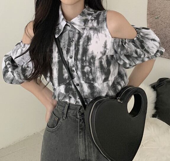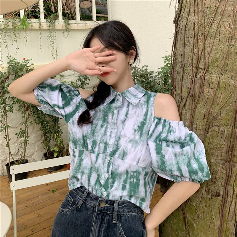 ブラウス しぼりデザイン パフスリーブ しぼり プリント グリーン ブラック ショート丈 デザイン 絞り染め トップ 新しい フレンチ ニッチ オフショルダー 半袖 シャツ 女性 シック ゆる リラックスタイム ストリート 人気 プラスサイズ 原宿スタイル 韓国スタイル トレンド かわいい 大人可愛い 大人女子 きれいめ おしゃれ お洒落 シンプル ラブリー キュート ガーリー 10代 20代 学生 通学 デート お出かけ 女子会 休日 イベント 普段使い 部屋着 ショッピング 買い物 インポート
