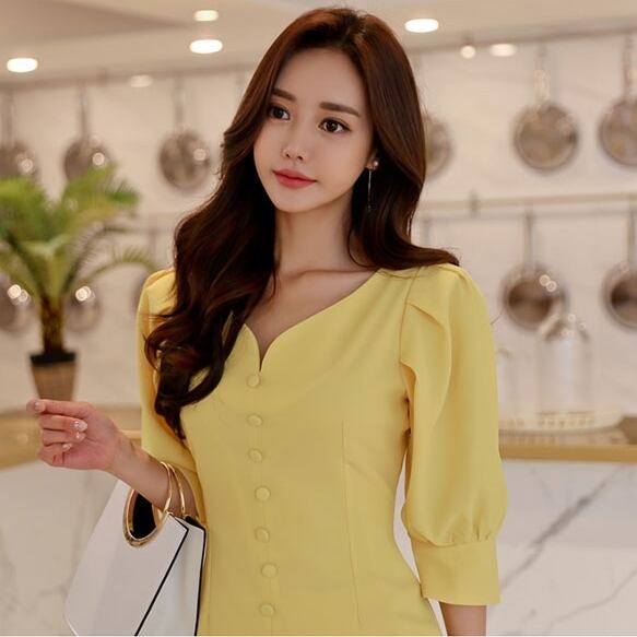 ワンピース レディース 黄色 イエロー パフスリーブ 無地 タイト ひざ丈 ワンピドレス Vネック スリム 細身 スプリット ロングスカート ハイウェスト シンプル 上品 きれいめ 大人可愛い 大人女子 おしゃれ アジアン ガーリー ラブリー キュート 存在感 主役級 エレガント モダン フォーマル 10代 20代 ママ 母の日 誕生日 謝恩会 二次会 オフィス OL 通勤 学生 お出かけ 休日 デート 記念日 女子会 イベント パーティー 旅行 リゾート モテ 脚長 トレンド スタイル 普段使い