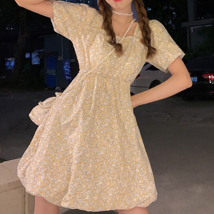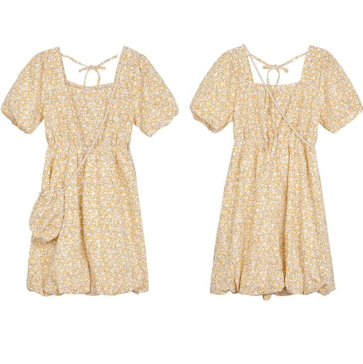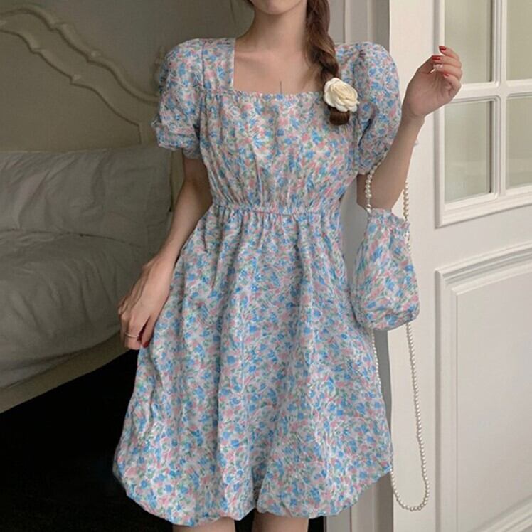 ワンピース ミディアム ミディ丈 フラワー プリント柄 パフスリーブ バルーン丈 ボリューム感 バッグ付き プチプラ スクエアネック イエロー ブルー S M 夏 スクエアカラー フローラル パフ スリーブ Aライン ウエスト 妖精 ドレス ひざ丈 ワンピドレス スプリット きれいめ 大人可愛い 大人女子 おしゃれ こなれ感 ガーリー ラブリー キュート10代 20代 誕生日 謝恩会 二次会 学生 お出かけ 休日 デート 記念日 女子会 イベント パーティー 旅行 リゾート モテ トレンド 海外